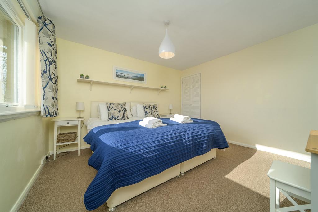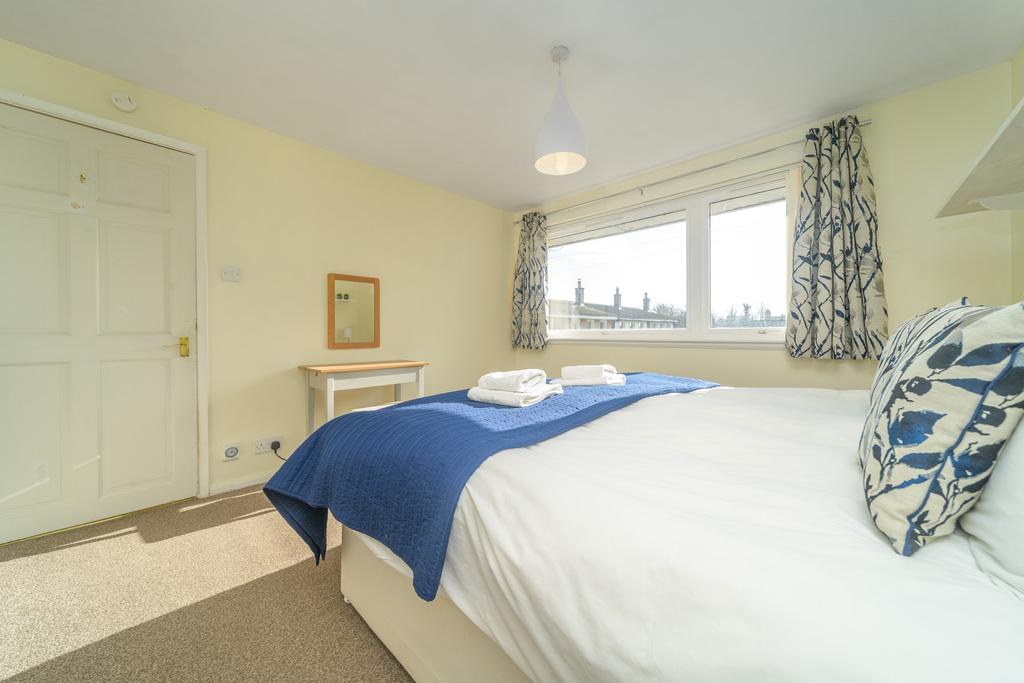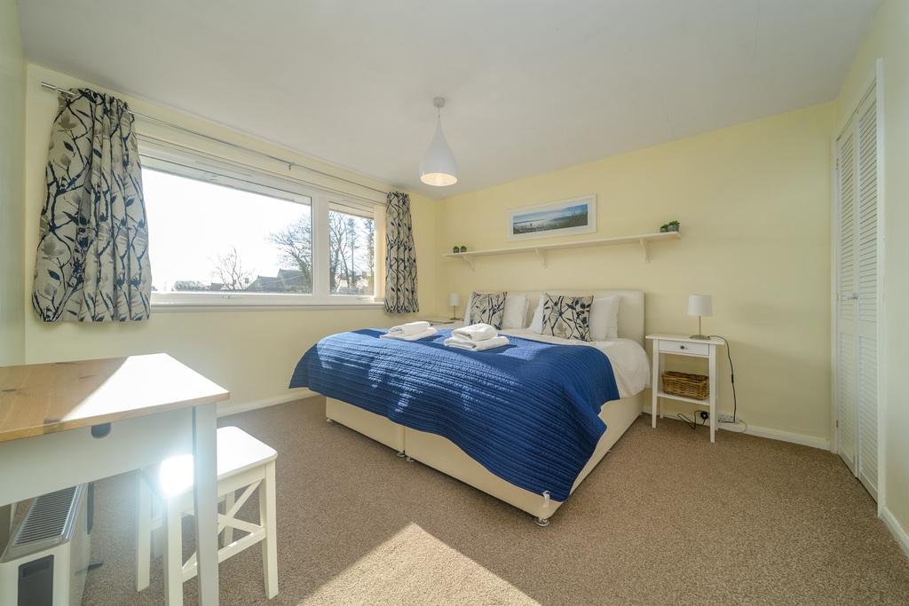 The primary bedroom, with built-in storage, is a spacious king-sized room with a large window taking advantage of views to the front.