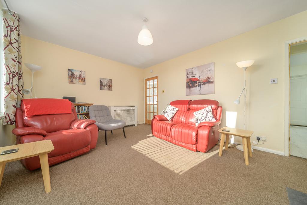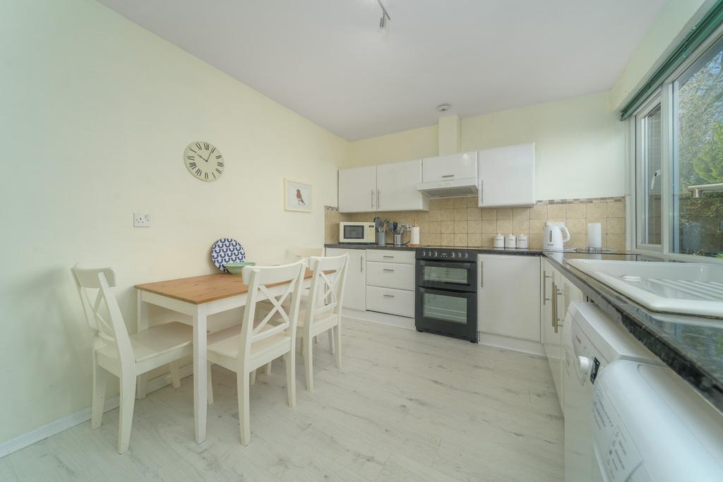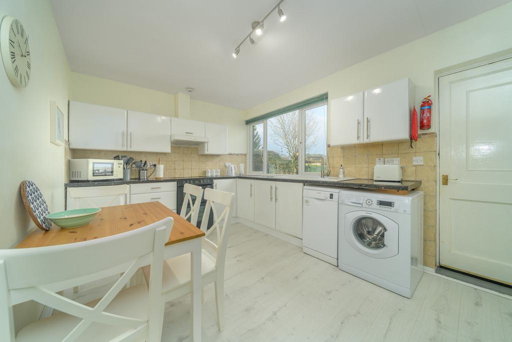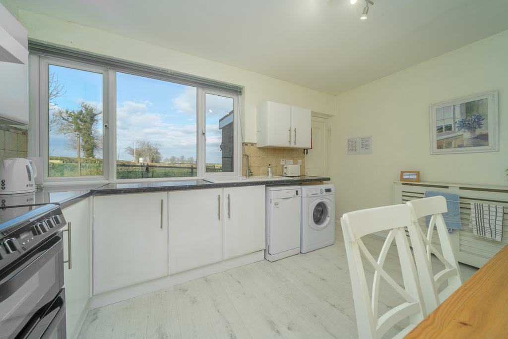A door leads from the lounge into the kitchen, with LVT flooring, which offers a good number of wall and base units with a white-painted door complemented by a dark stone-look laminate worksurface and sandstone coloured splash back tiling. In terms of fitted equipment, there is a single bowl white ceramic sink beneath a large window providing uninterrupted views over the rear garden, an under-bench oven and a four-ring electric hob beneath a built-in extractor fan. There is space and plumbing for a washing machine and a slimline dishwasher. The room comfortably accommodates a dining table and accompanying chairs. A door opens to a useful utility room where there is space for a free-standing fridge-freezer and a tumble dryer. A composite door provides external access to the rear garden.