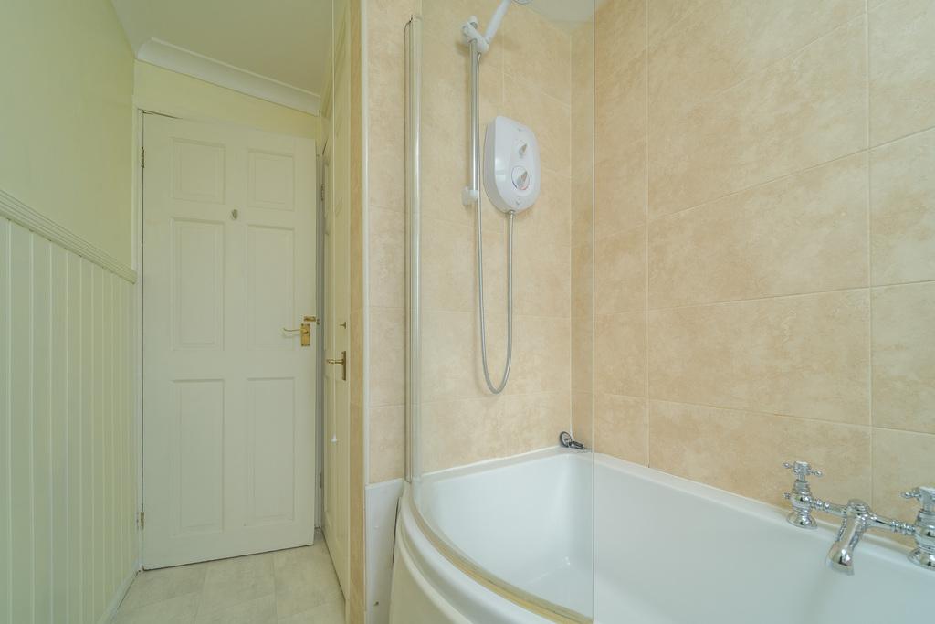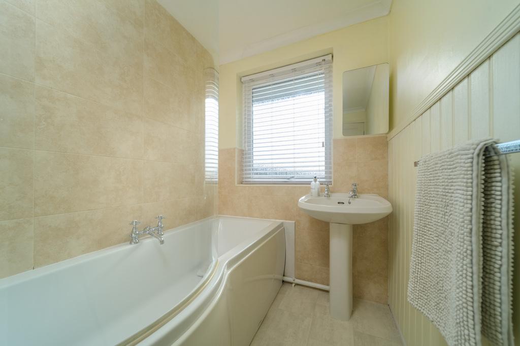 The separate WC comprises a close coupled toilet with a push button behind and a window allowing for natural light. The space is finished with tile-look vinyl flooring which matches that of the bathroom opposite which comprises a P shaped white bath with an electric shower over behind a glass shower screen and a pedestal hand wash basin. Natural light enters via a window to the front of the property.