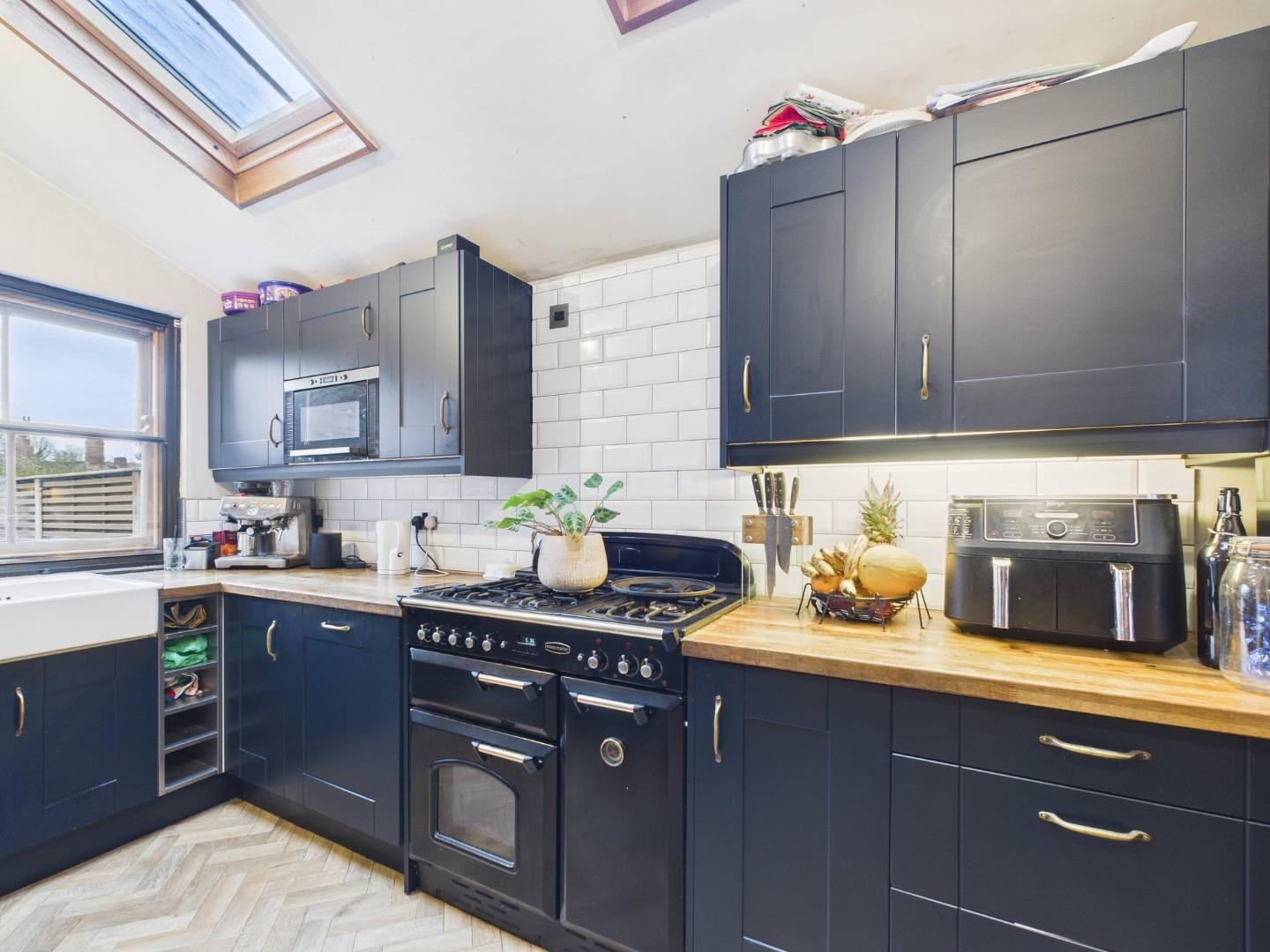 Kitchen - 4.36m x 2.03m (14'3" x 6'7" ) - With a continuation of the herringbone flooring and having exposed brick to one wall, this kitchen is fitted with a range of wall, base and drawer units with solid wood work surfaces and stylish tiled splashbacks. There is an integrated dishwasher, space for a fridge freezer and currently in situ is a large range style cooker with electric oven and gas hob. The inset porcelain Butler sink with mixer tap is ideally situated beneath the sash window to the rear which overlooks the garden. There are also two double glazed skylights and an internal window into the sitting room.