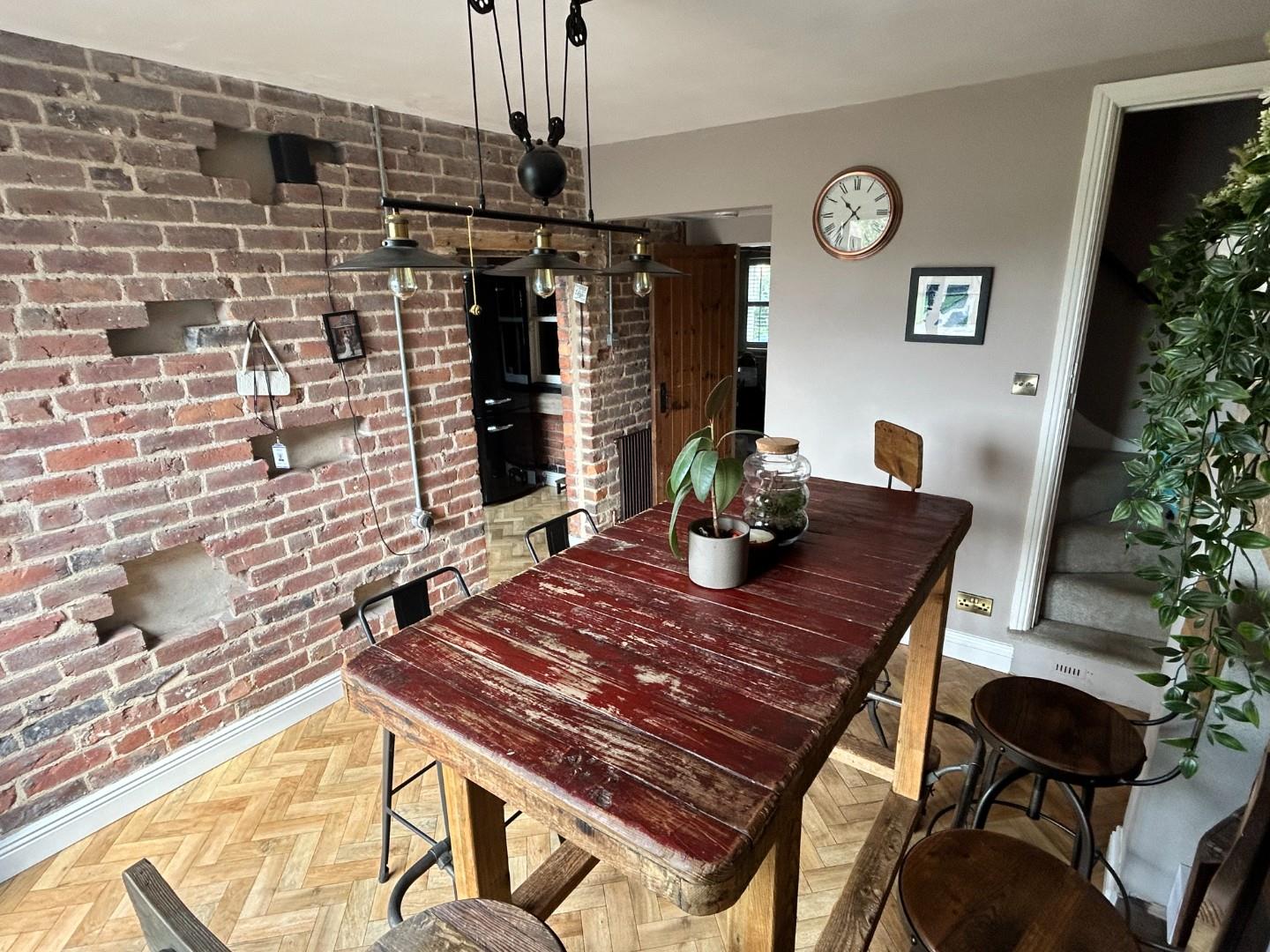 Dining Room - 3.45m x 2.88m (11'3" x 9'5" ) - With herringbone oak-effect Karndean flooring, this spacious dining room enjoys an exposed brick feature wall and a recessed fireplace to the opposite side. A door provides access to the staircase rising to the first floor, while glazed French doors open out to the rear garden. A further door opens to a most useful understairs storage cupboard. An open doorway to the side leads through to the kitchen.