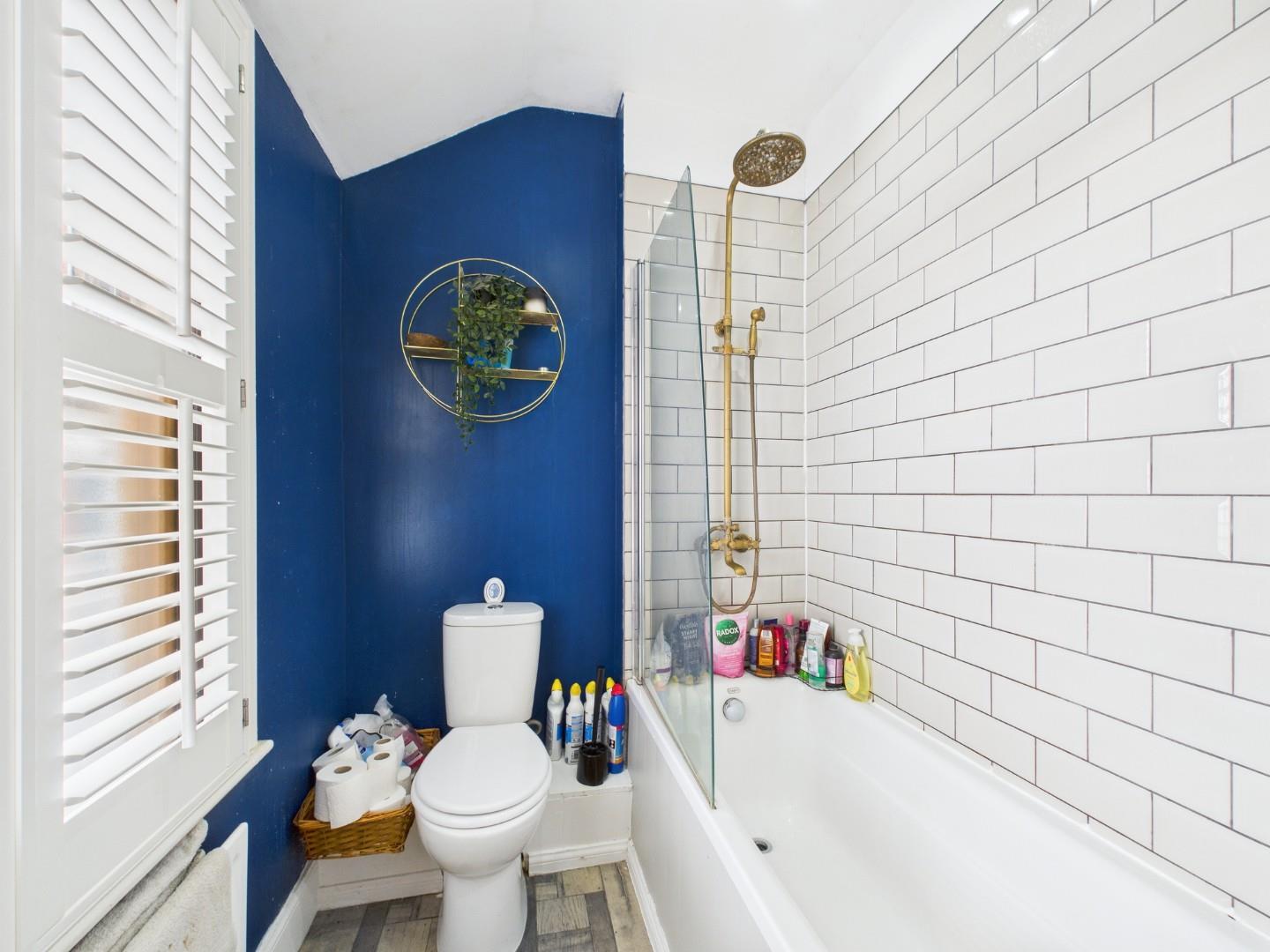 Bathroom - 2.25m x 1.65m (7'4" x 5'4" ) - With wood effect flooring, this bathroom is fitted with a three piece suite comprising a low flush WC, a wooden wash stand with porcelain wash hand basin and a panelled bath with thermostatic rainfall shower and additional hose attachment. There is an obscured glass sash window with secondary glazing and fitted shutters to the rear aspect.
