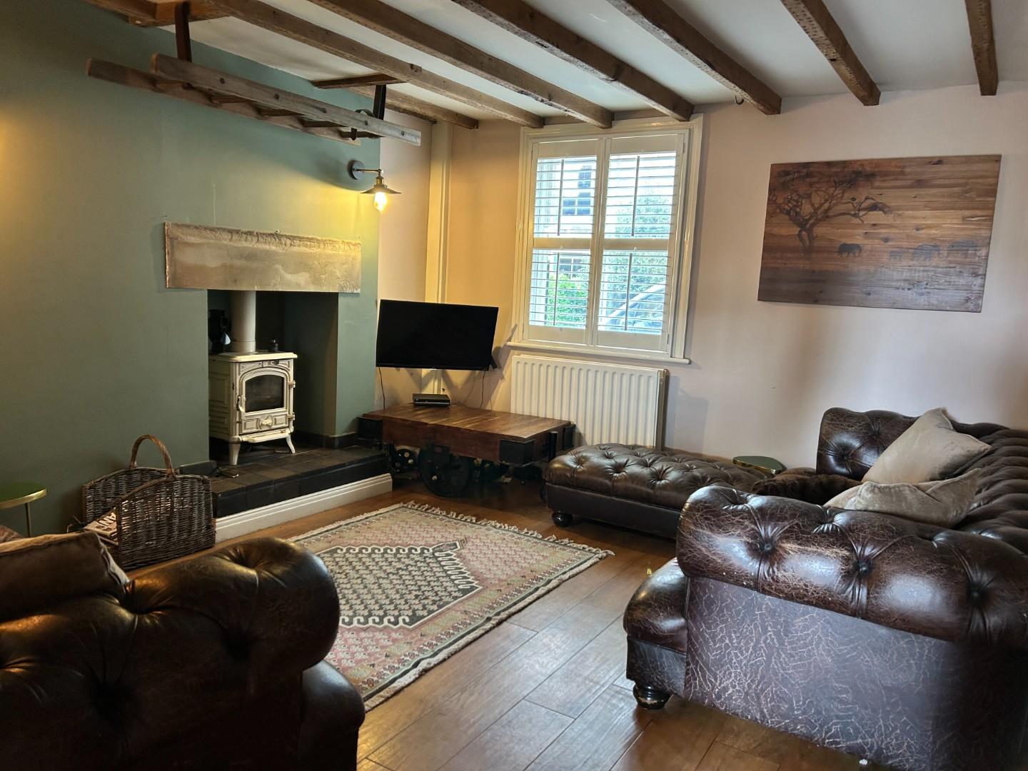 Sitting Room - 4.02m x 3.35m (13'2" x 10'11" ) - This is a most inviting reception room, full of character with exposed ceiling timbers and oak-effect Karndean flooring. The recessed fireplace with tiled hearth and sandstone mantel provides a pleasant focal point and houses the multi-fuel stove. To the front aspect is an original sash window which benefits from secondary glazing and bespoke fitted shutters.