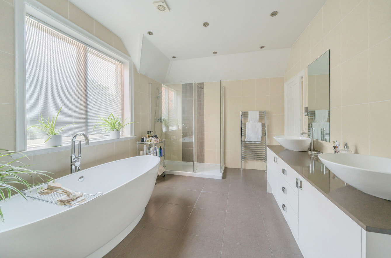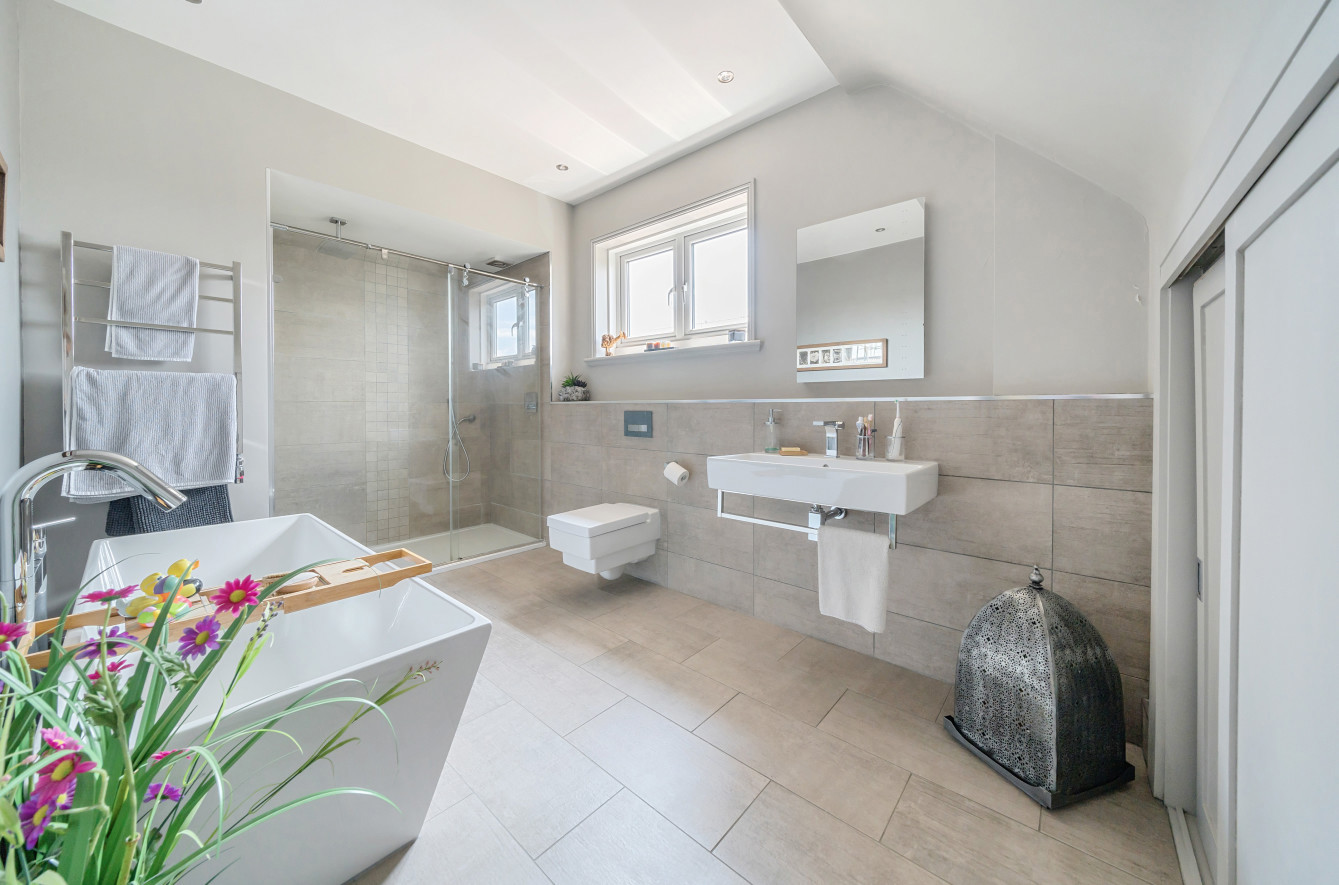 Four of the six bedrooms are on the first floor. The principal suite has an Edwardian hallmark box bay window overlooking the garden and includes a fabulous dual aspect ensuite with standalone oval bath tub, large walk-in shower, twin basins and granite topped vanity units. This leads to bedroom four which is currently set up as a large dressing room (also accessed from the hall) with window and a wide range of fitted wardrobes and drawers. Bedrooms two and three also have ensuites, both including a bath. Bedrooms five and six (with eaves storage) are on the second floor and share a family bathroom.