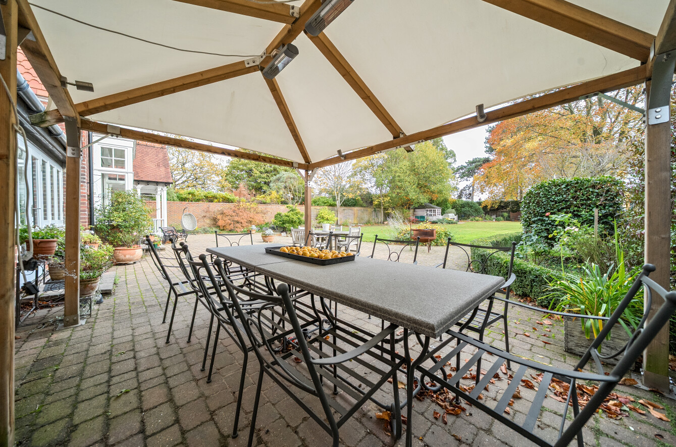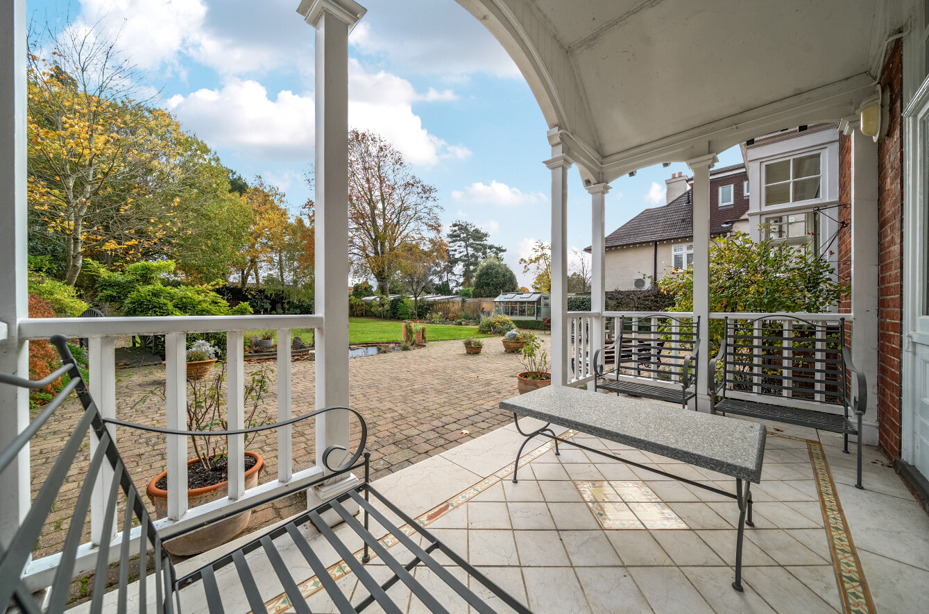 The immense southerly rear garden (187’) is utterly delightful with a very grand rear porch and a deep patio providing ample seating and dining space, and this leads to a vast grassed area with flower beds and vegetable patch, all flanked with mature trees and shrubs. Outbuildings include a potting shed and a 162 sq ft garden cabin (with toilet and kitchenette) offering additional space for perhaps a home office, play room or similar.