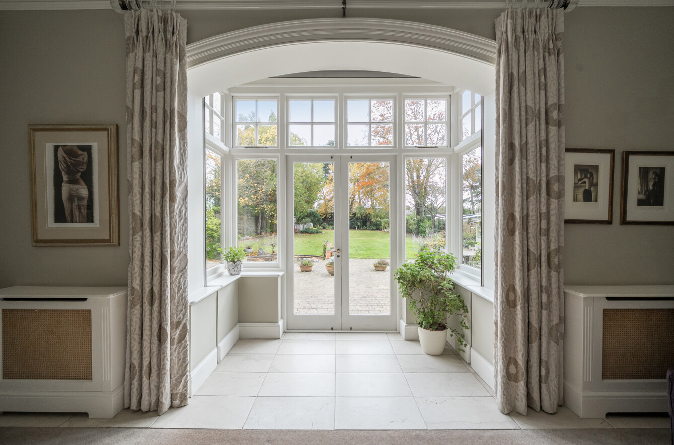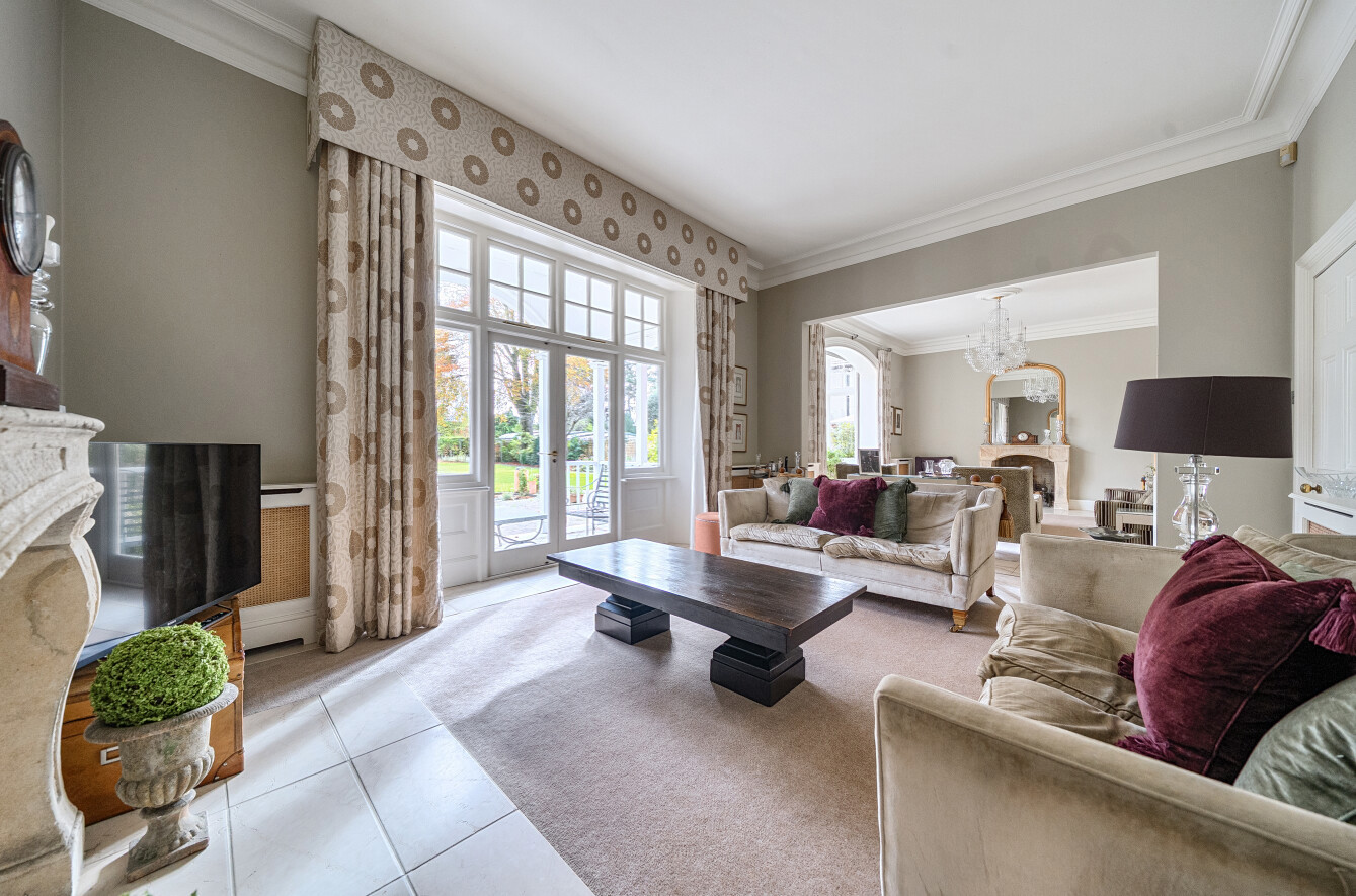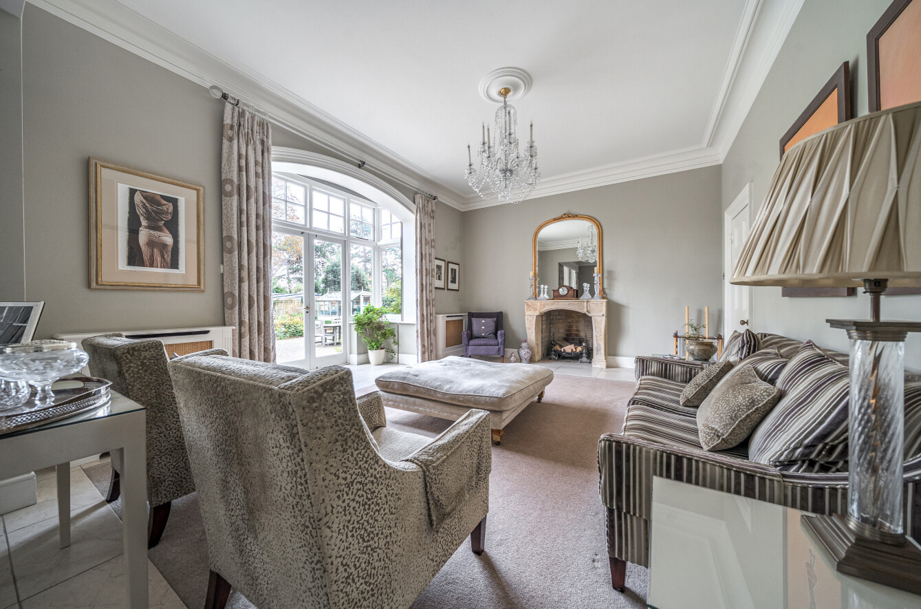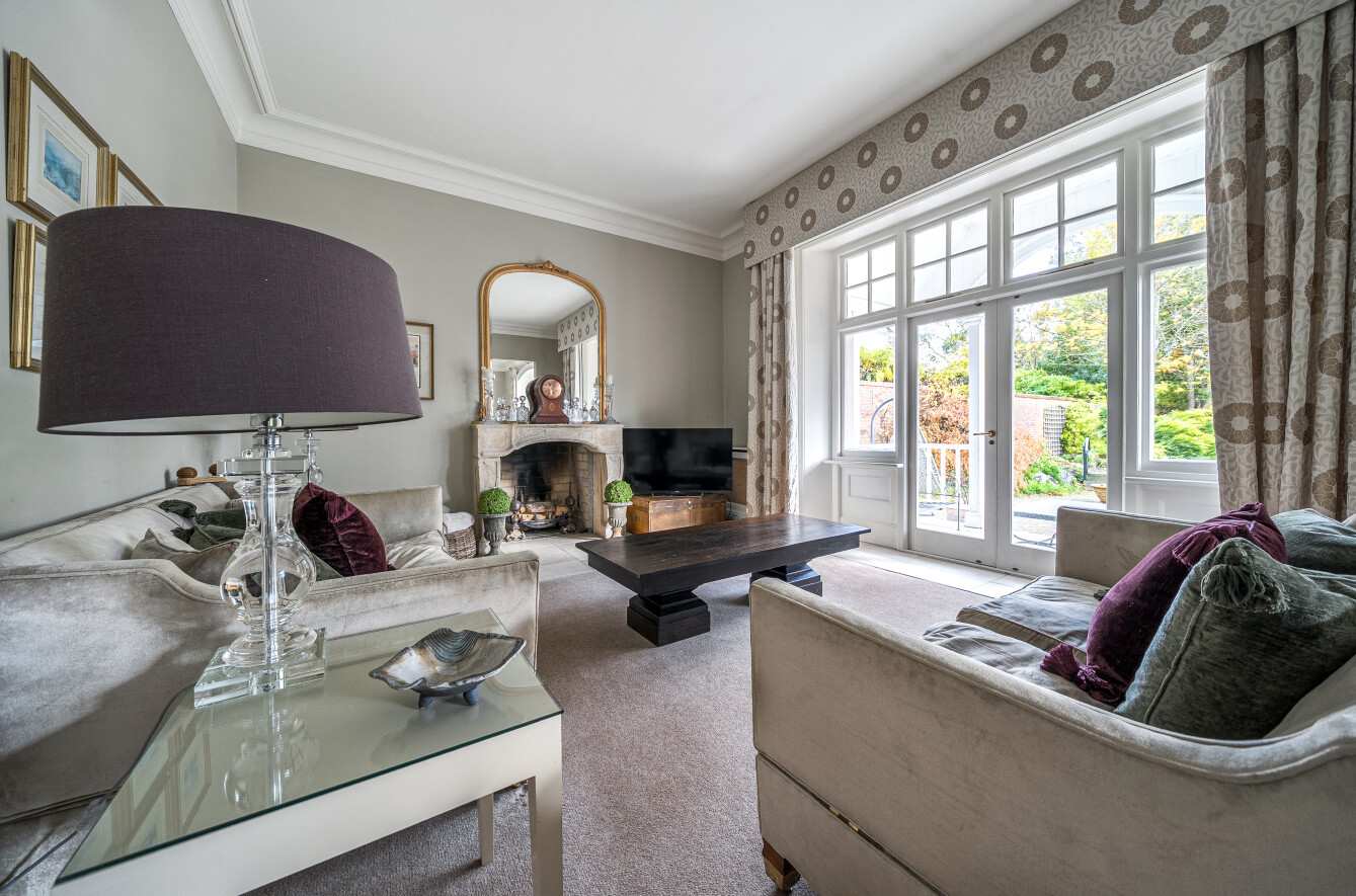 The absolutely delightful living room is a sizeable 500 sq ft with a pair of double doors each set within a recessed bay opening to the rear garden with wonderful views and giving considerable light to this room, and there are two original substantial stone fireplaces creating focal points to frame this grand space.