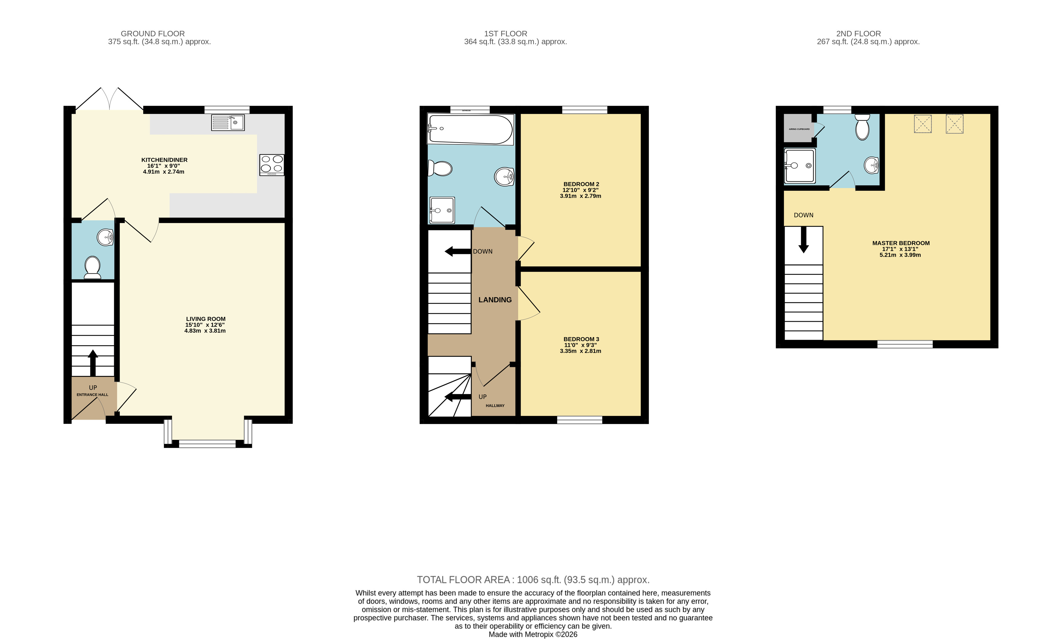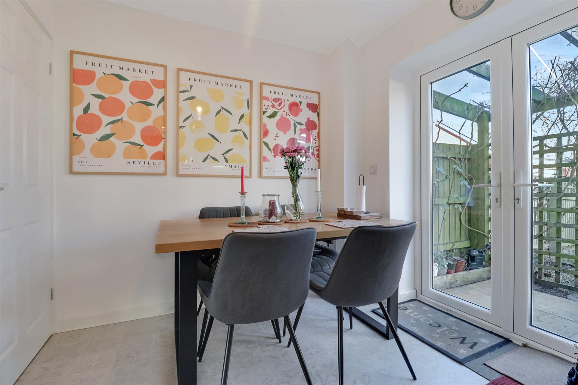 A door straight ahead leads into the heart of the home the stylish kitchen diner. This well-appointed space features modern base and eye-level units, a built-in dishwasher integrated washing machine and ample space for additional white goods. Ideal for family dining or entertaining friends, the room is further enhanced by French doors that flood the area with natural light while offering views over the rear garden. A convenient downstairs WC is also located off this space.