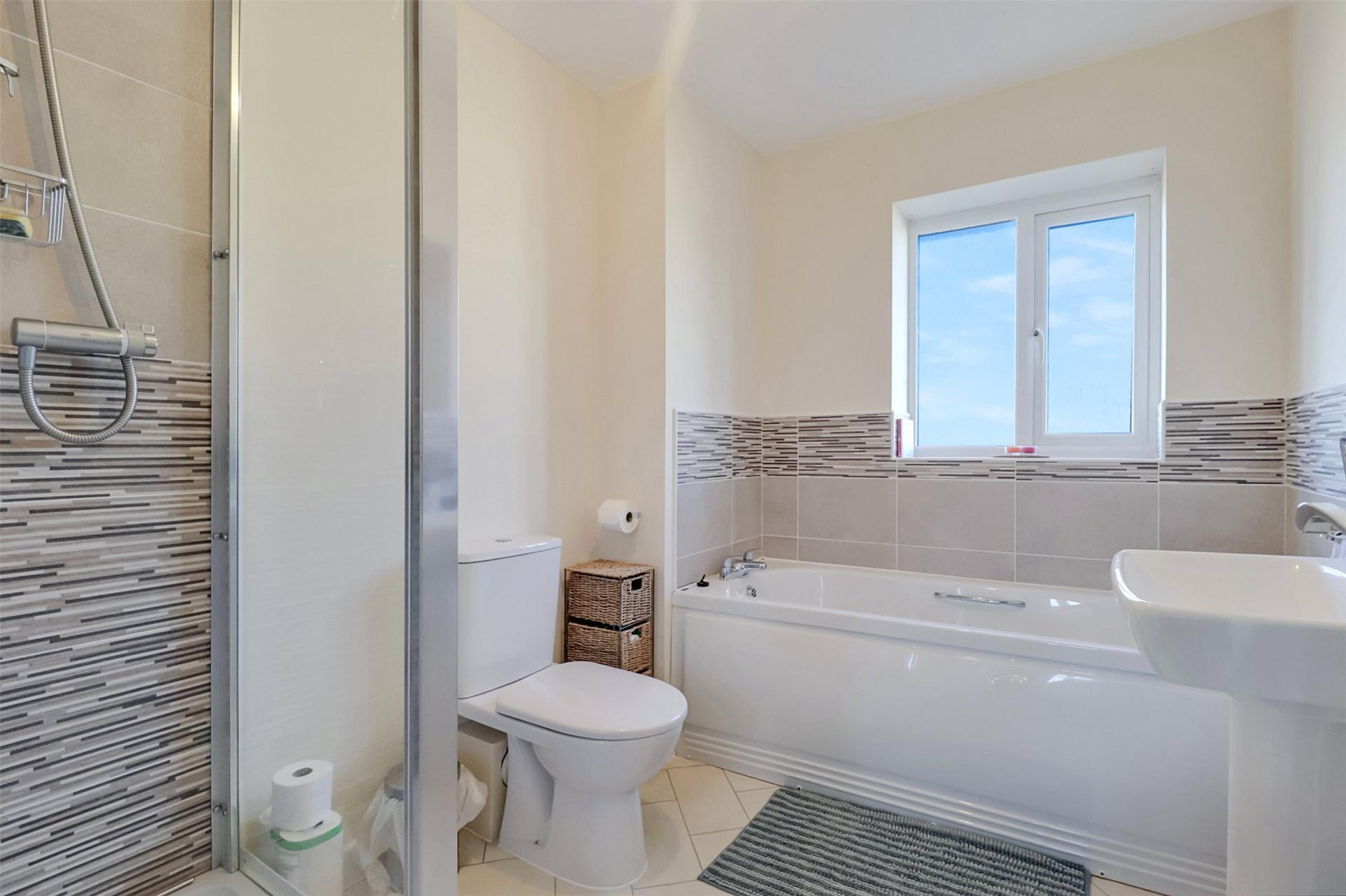 Back into the entrance hall stairs rise to the first floor. There is a modern family bathroom, thoughtfully designed to combine style and practicality. It features a separate walk-in shower and a sleek bathtub, offering flexibility for busy family life or moments of relaxation. A contemporary washbasin and WC complete the space.