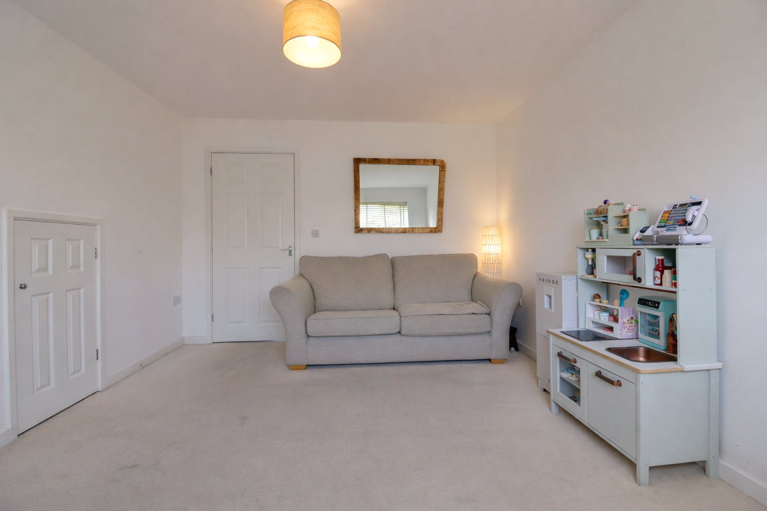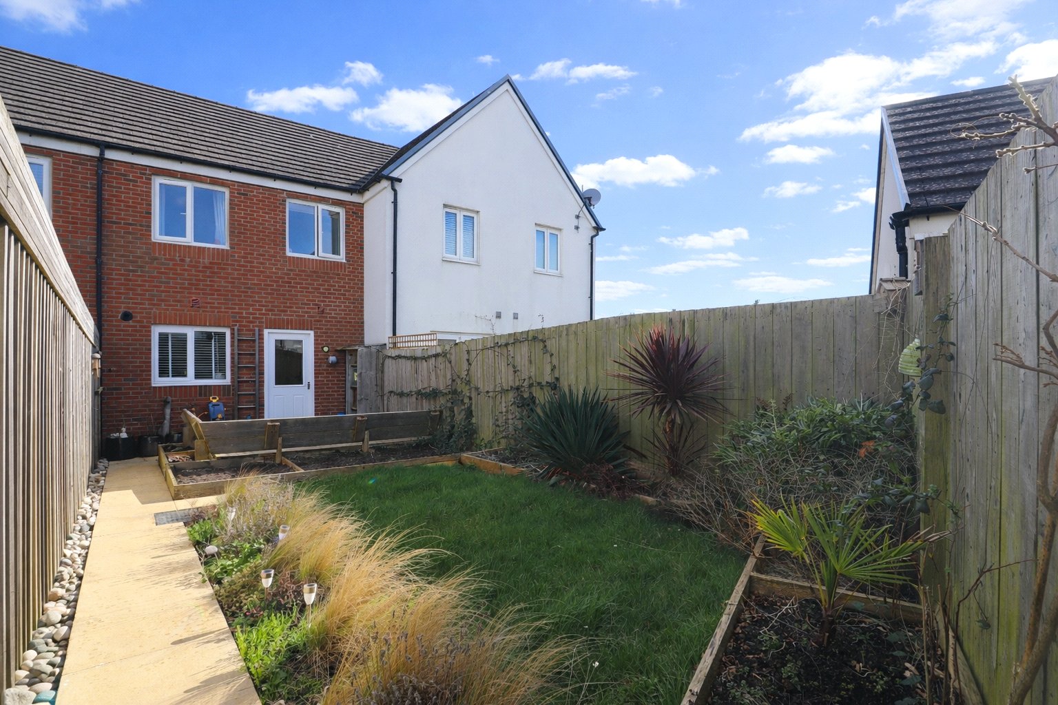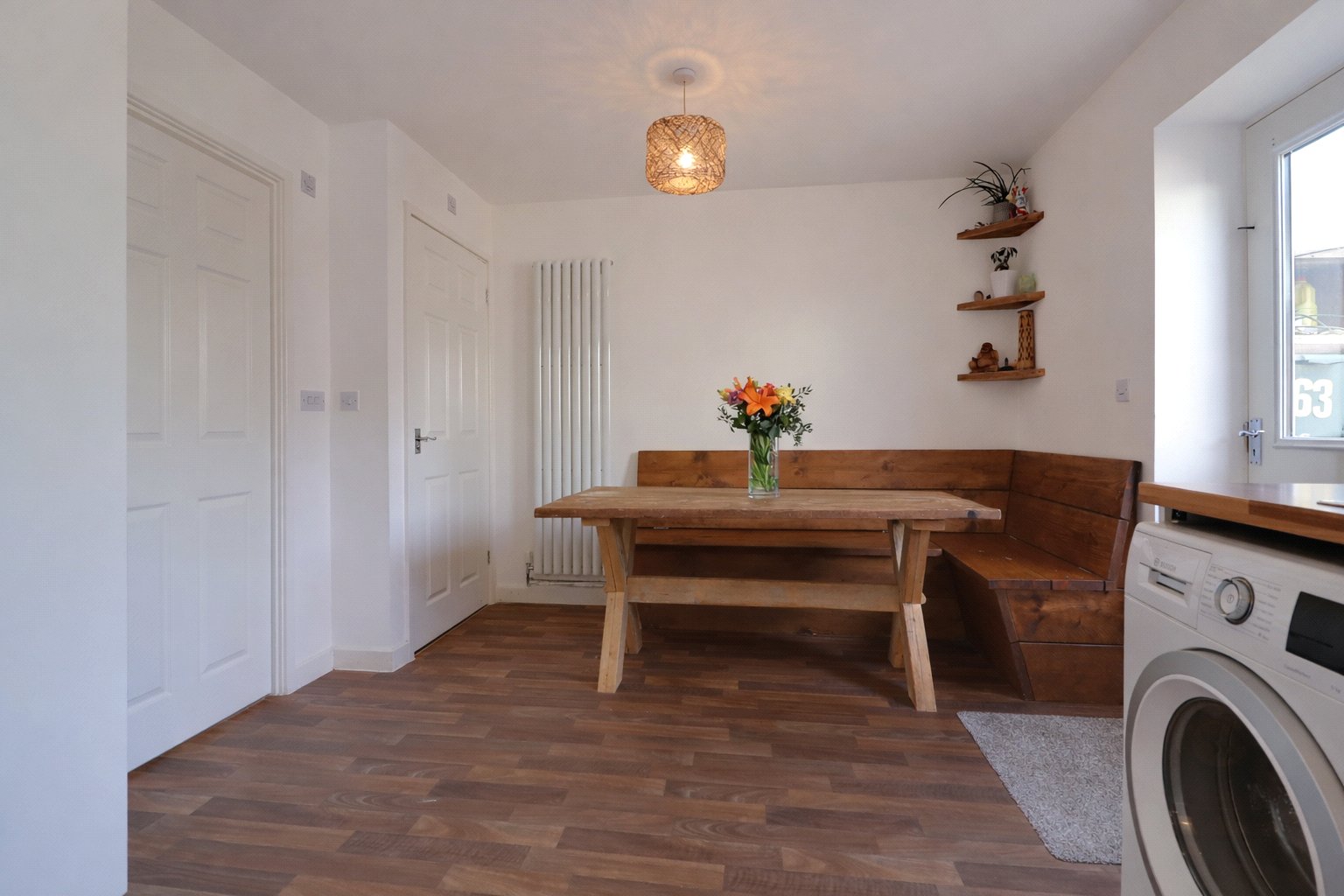 Externally, the property is arranged for minimal upkeep. Immediately outside the rear door is a paved patio area, providing an ideal spot to sit out in warmer months. Beyond this, a larger lawned area offers a safe and secure space for children to play. A gate leads through to the garage and off road parking, adding practicality for day to day life.
