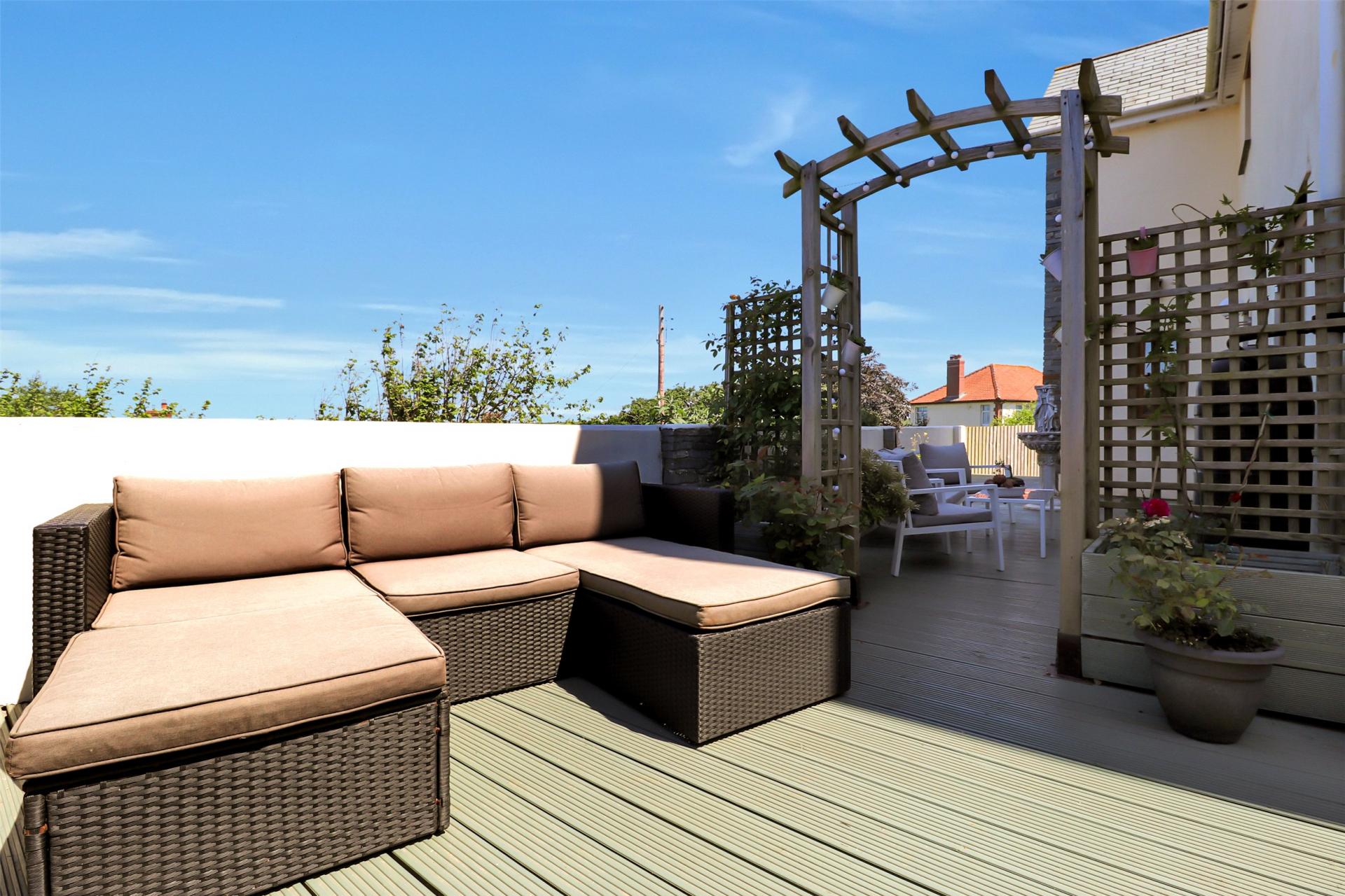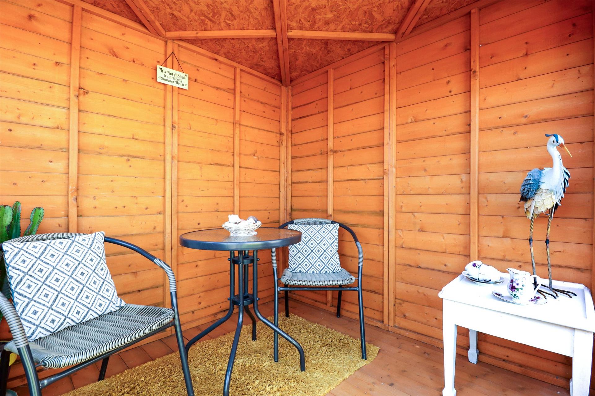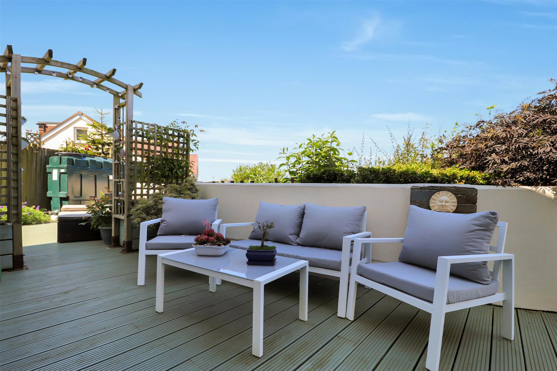 To the outside the rear garden stretches around the property with multiple seating areas including large wooden decking with tables and chairs, through to a sun trap patio or steps from the decking leading to a section that includes further shrubs, bushes, storage shed, pond and garden room.