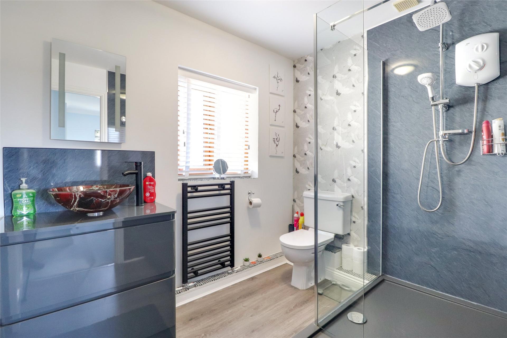 The modern family shower room comprises a close coupled WC, stunning glass wash basin and large walk in shower.