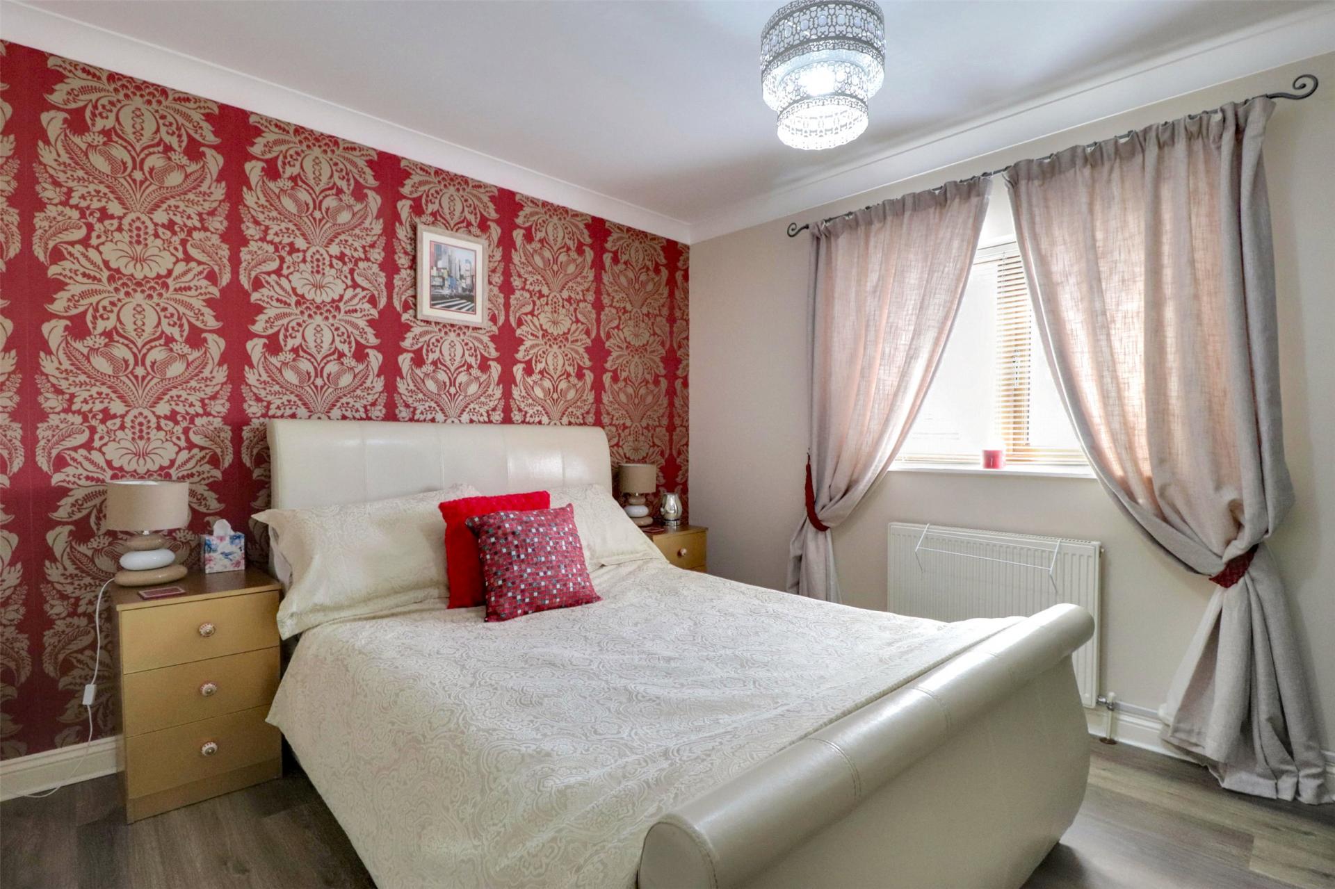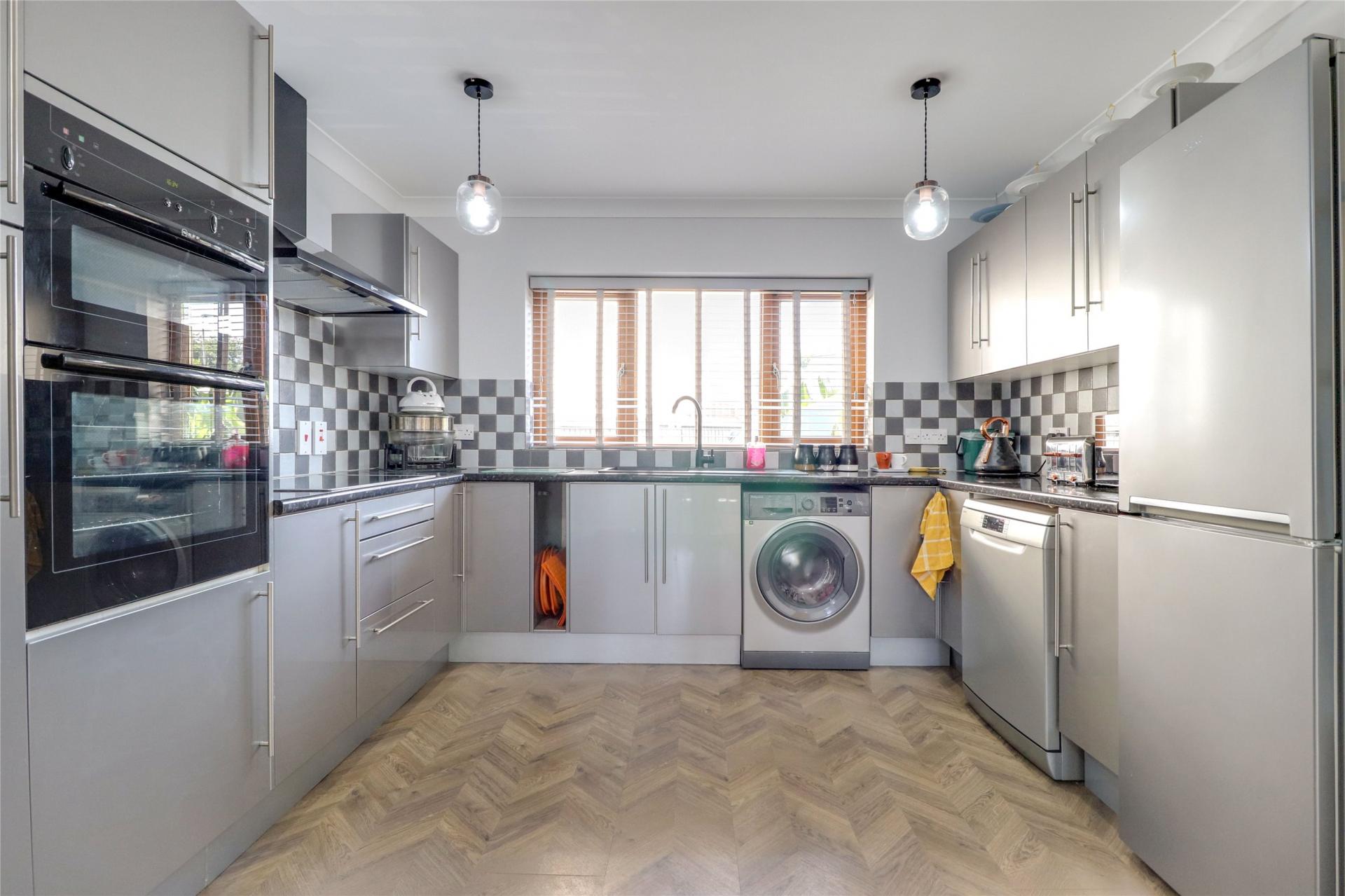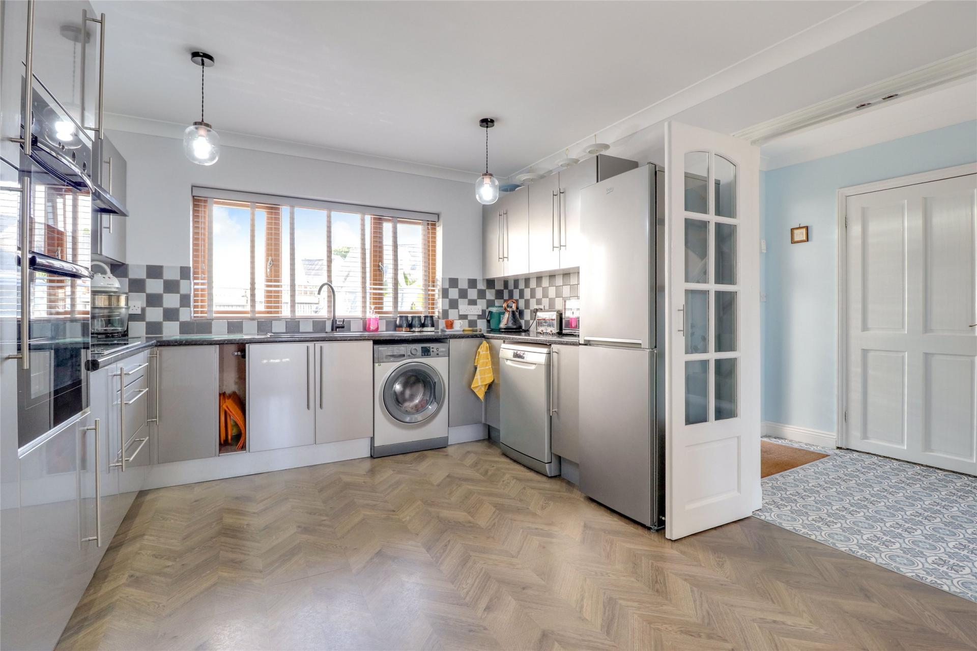 Double doors to the right lead through to a large modern fitted kitchen overlooking the front of the property, comprising multiple eye and base level units including fitted electric oven, electric hob and space for multiple washing appliances and free-standing fridge freezer.