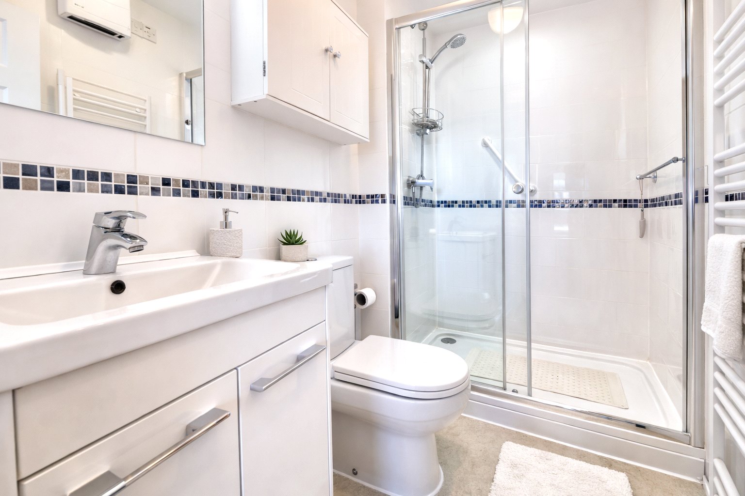 The property offers three bedrooms, including two generous doubles, both benefiting from large fitted wardrobes and a third single bedroom. The master bedroom further enjoys a fitted en-suite shower room, complete with WC, wash basin, electric towel rail, and a spacious shower cubicle.