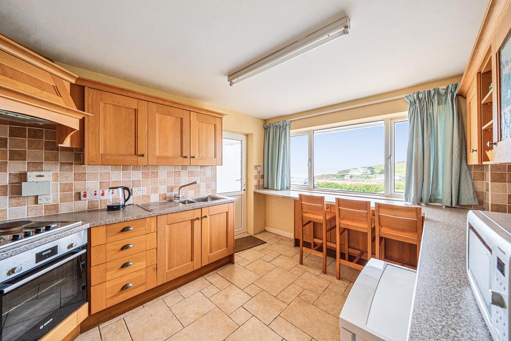 An entrance porch opens to the inner hall, connecting the accommodation: three bedrooms, a sitting/dining room, a kitchen and a shower room. The triple-aspect sitting/dining room features a large picture window to the front framing the sea and Burgh Island views, with a rear window overlooking the garden. The shower room comprises a corner shower unit, WC and basin. The kitchen enjoys a front-aspect window taking in the exceptional outlook and is fitted with matching base and wall units, an integrated electric oven and hob, space for appliances and a breakfast bar. The three bedrooms have a rear aspect with garden views.
