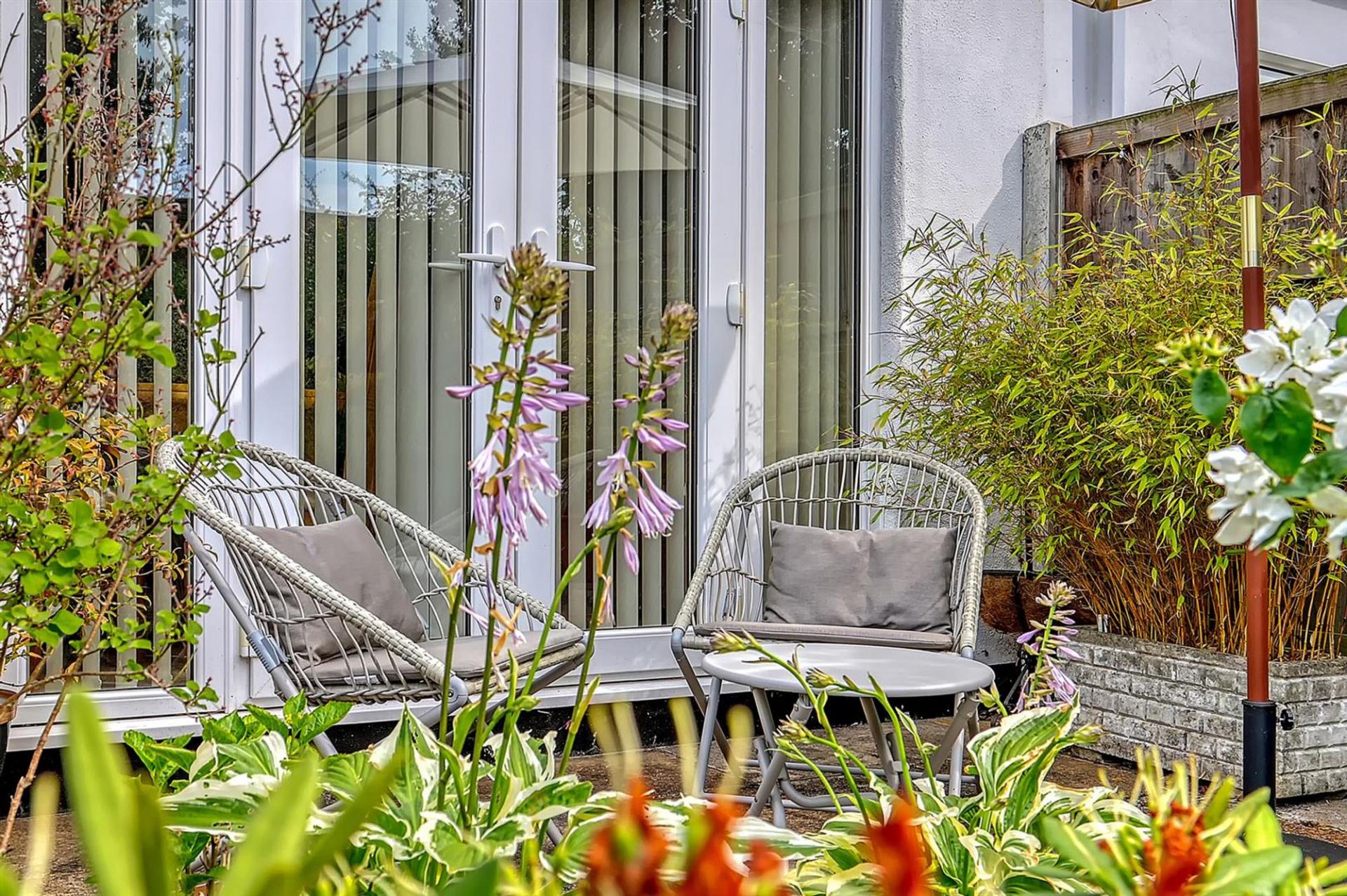The garden is well maintained and arranged around a central lawn with mature planting. There is a gate to the side leading to the driveway and garage.