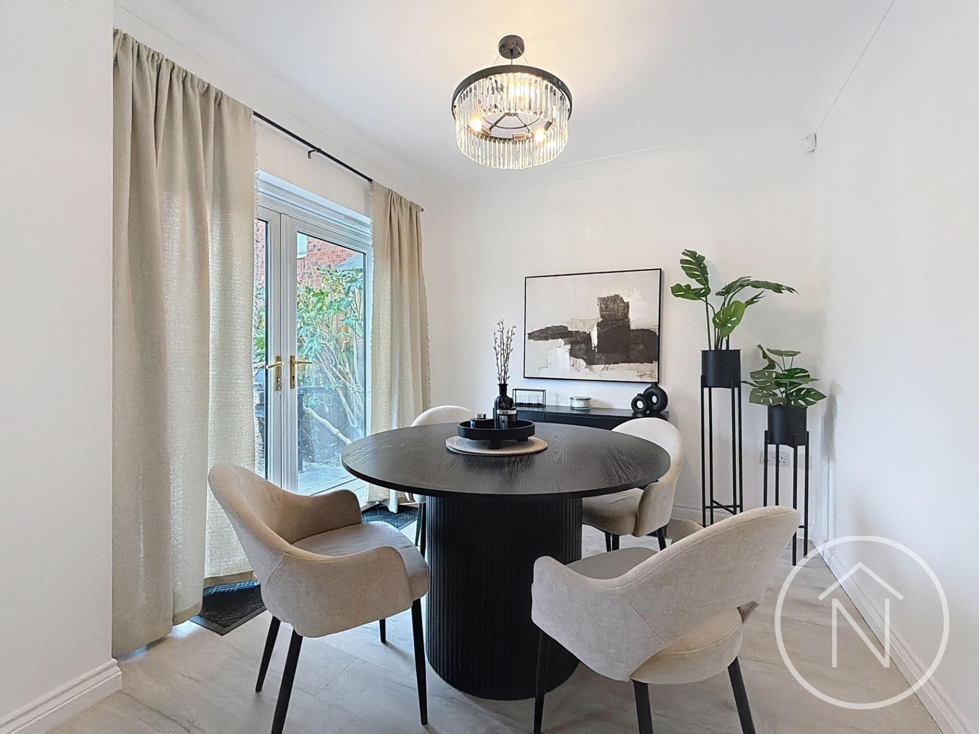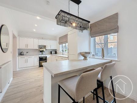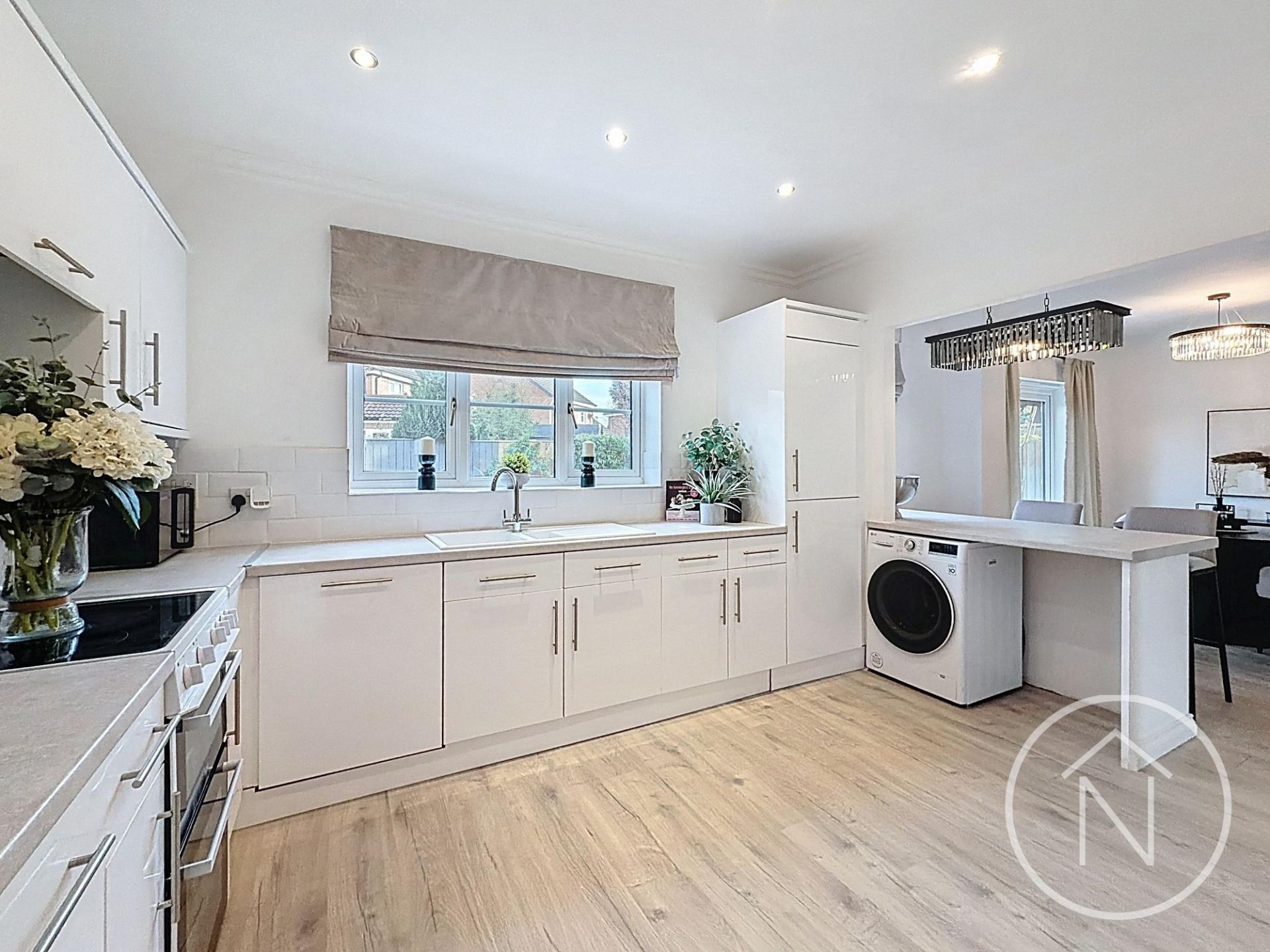 This exceptional four-bedroom, three-bathroom detached house offers an impressive blend of contemporary style and functional family living. Upon entering, a spacious hallway with light laminate flooring and a modern staircase provides a welcoming introduction, flowing seamlessly into the lounge filled with natural light. The property features two generous reception rooms, each with neutral décor, creating bright, inviting spaces ideal for both relaxation and entertaining. The heart of the home is a striking open plan kitchen and dining area, equipped with sleek white units, a stylish breakfast bar, and a central island. Expansive windows and French doors flood the space with light and lead directly onto a patio and into the rear garden, perfect for indoor-outdoor living.