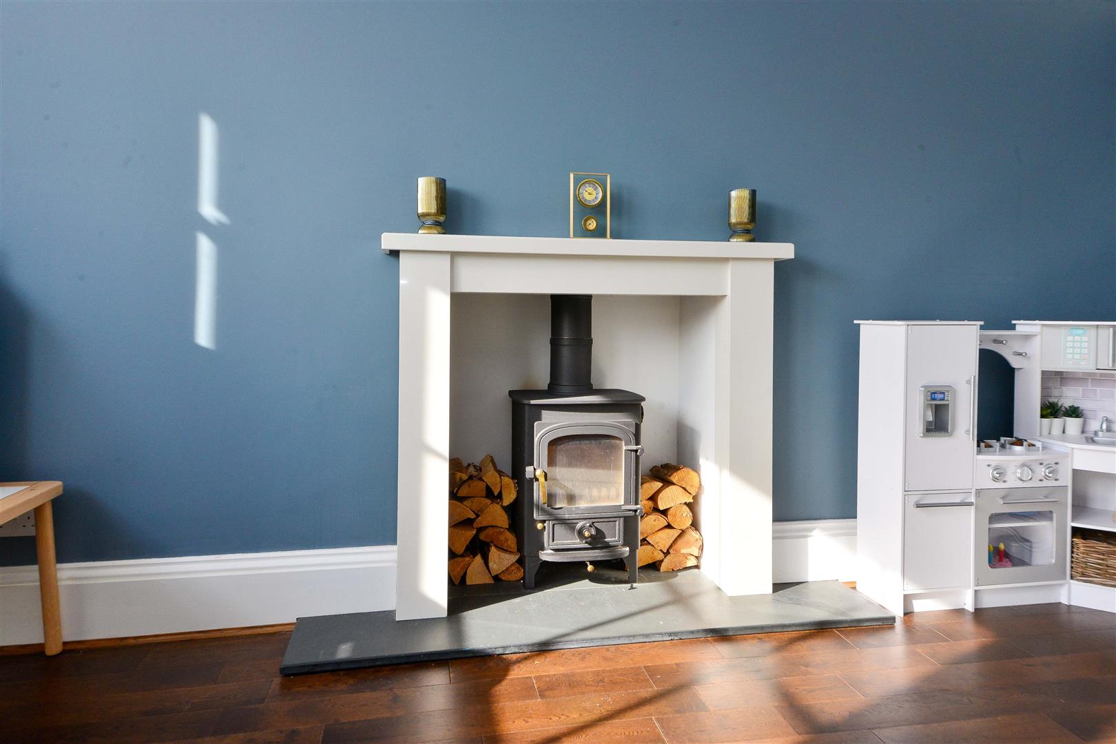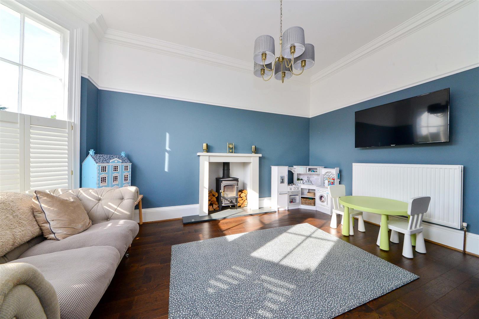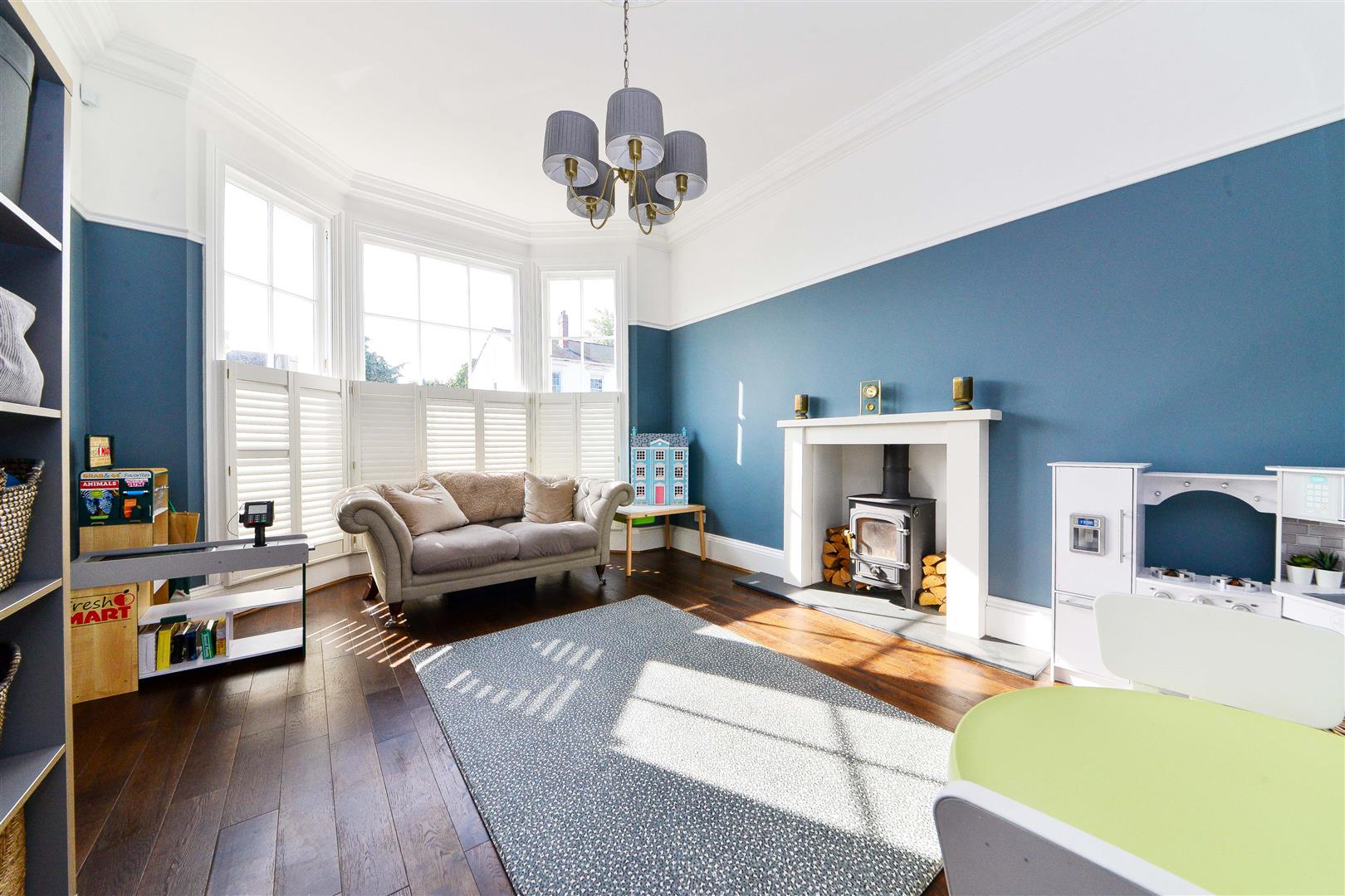 Sitting Room - Triple sash bay window with shutters, dark Oak flooring and a wood burning stove set on a slate hearth. Ceiling light point and original cornices.