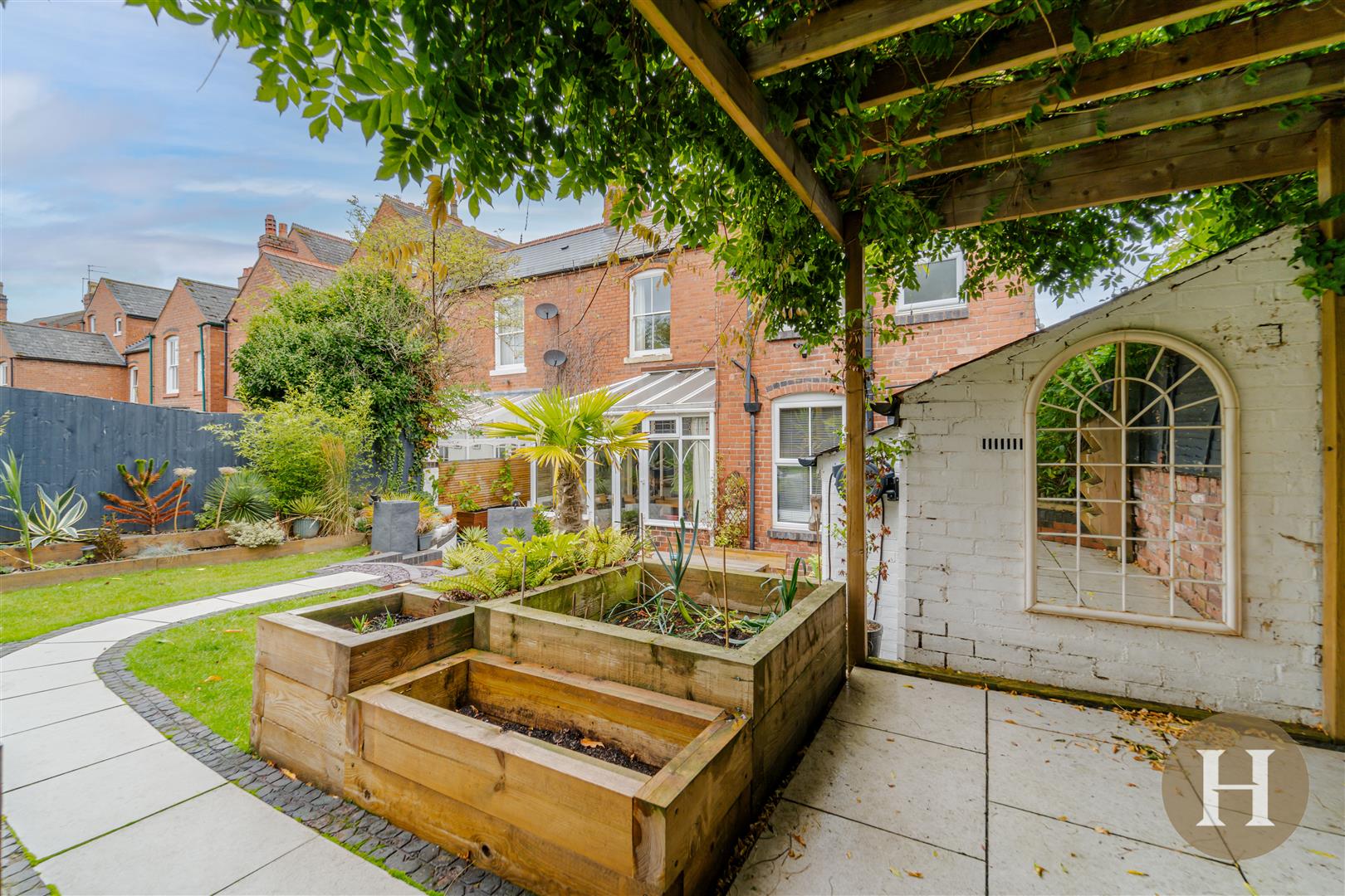 Garden - A beautifully maintained tiered rear garden with patio area and steps leading to lawn, with decorative flowerbeds, mature bushes and plants. Boasting wooden pagoda and seating area.