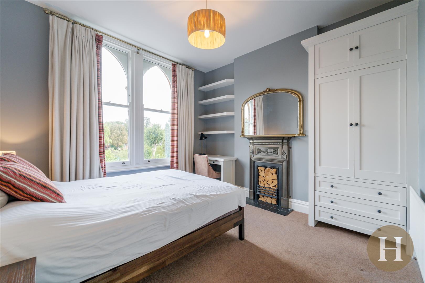 Bedroom Two - Double glazed sash windows to front elevation, feature cast iron fireplace, fitted wardrobes, shelving and central heating radiator.