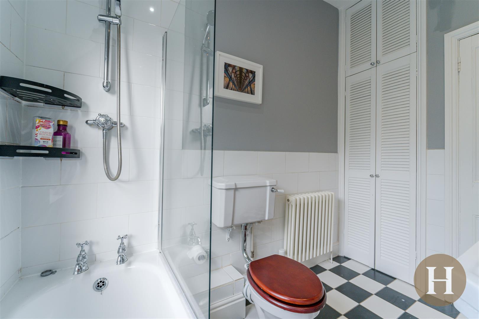 Bathroom - Partially tiled bathroom with double glazed window to rear elevation comprising WC, pedestal wash hand basin, bath with chrome mixer taps and shower above. Traditional style radiator, medicine cabinet and storage cupboard.