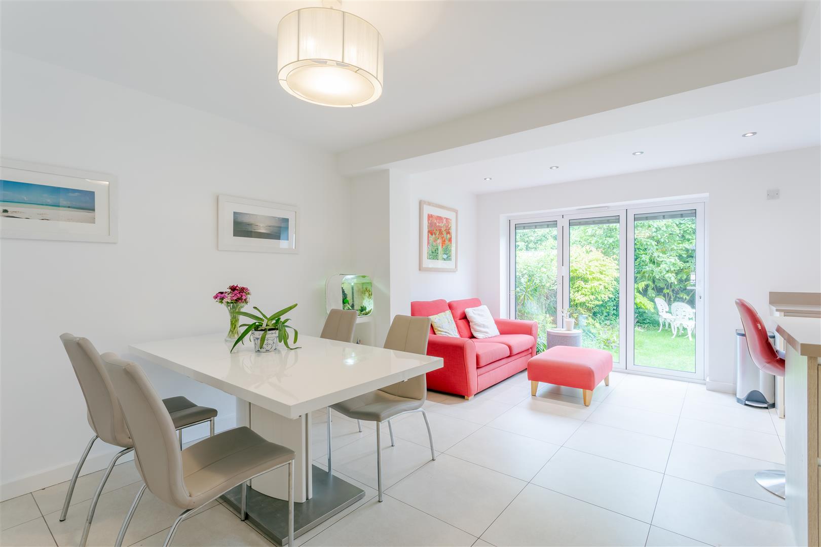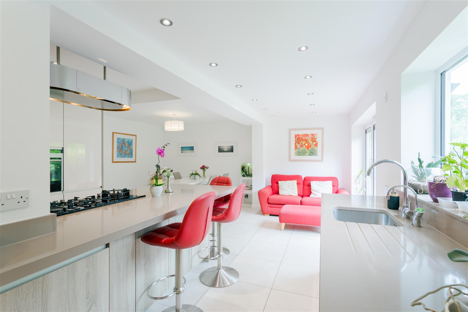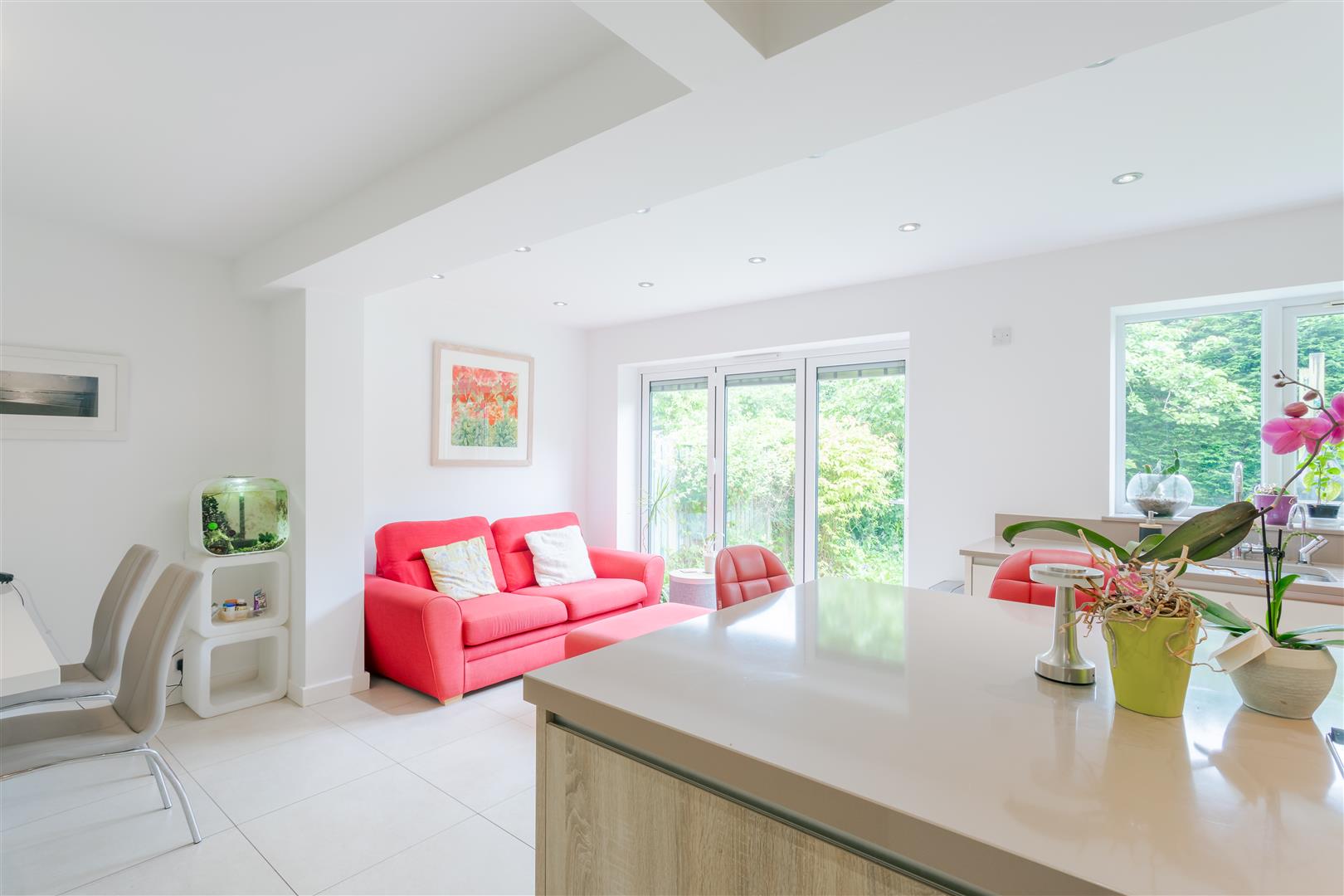 Kitchen Living Diner - Modern fitted kitchen, benefitting from dining area and living room area. The extensive room allows for a fantastic family space, open to configuration for living space or dining. The focal centrepiece island offers ample storage, breakfast bar and hob. Bespoke fitted units with integrated appliances, and tiled flooring boasting underfloor heating. Nestled within the corner is also a convenient study area, along with giving access to the utility and hallway. Two double glazed windows to the rear elevation along with bi-fold doors leading into the garden.