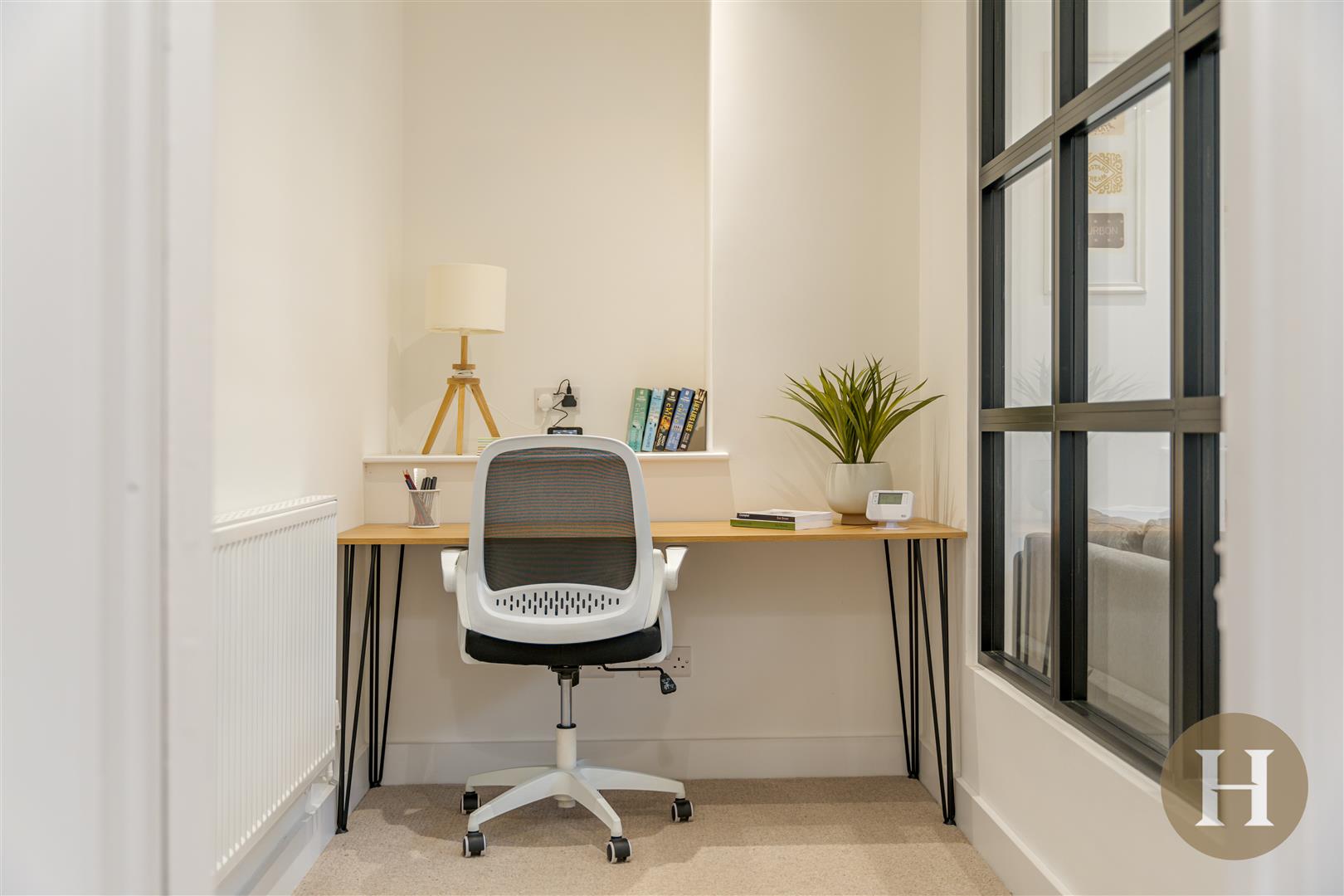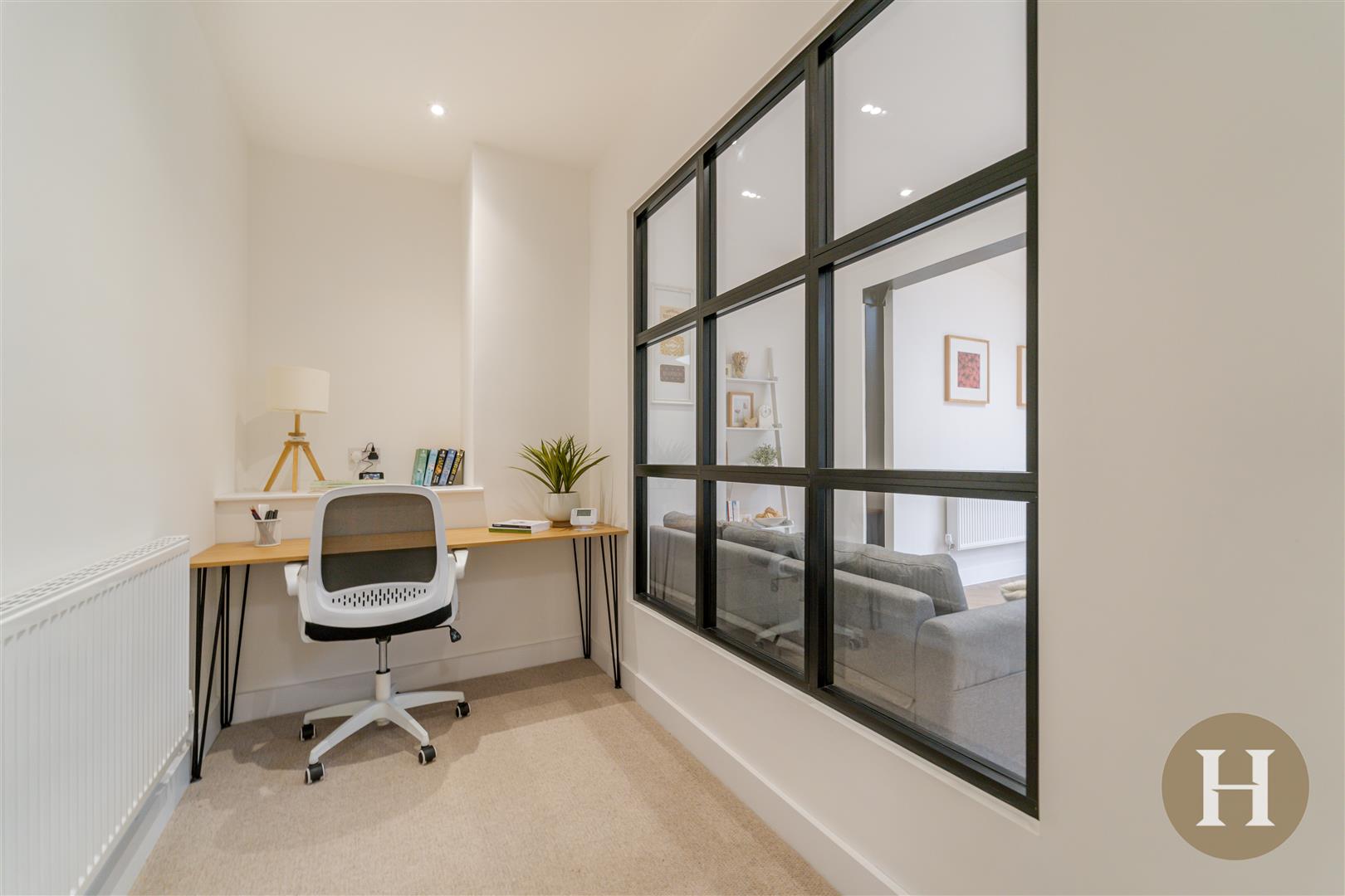 Study - Carpeted flooring, ceiling light pendant, radiator and aluminium glass window with view to kitchen diner.