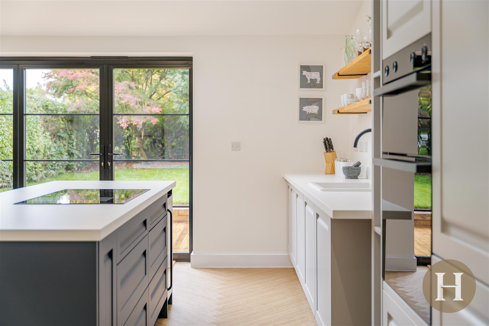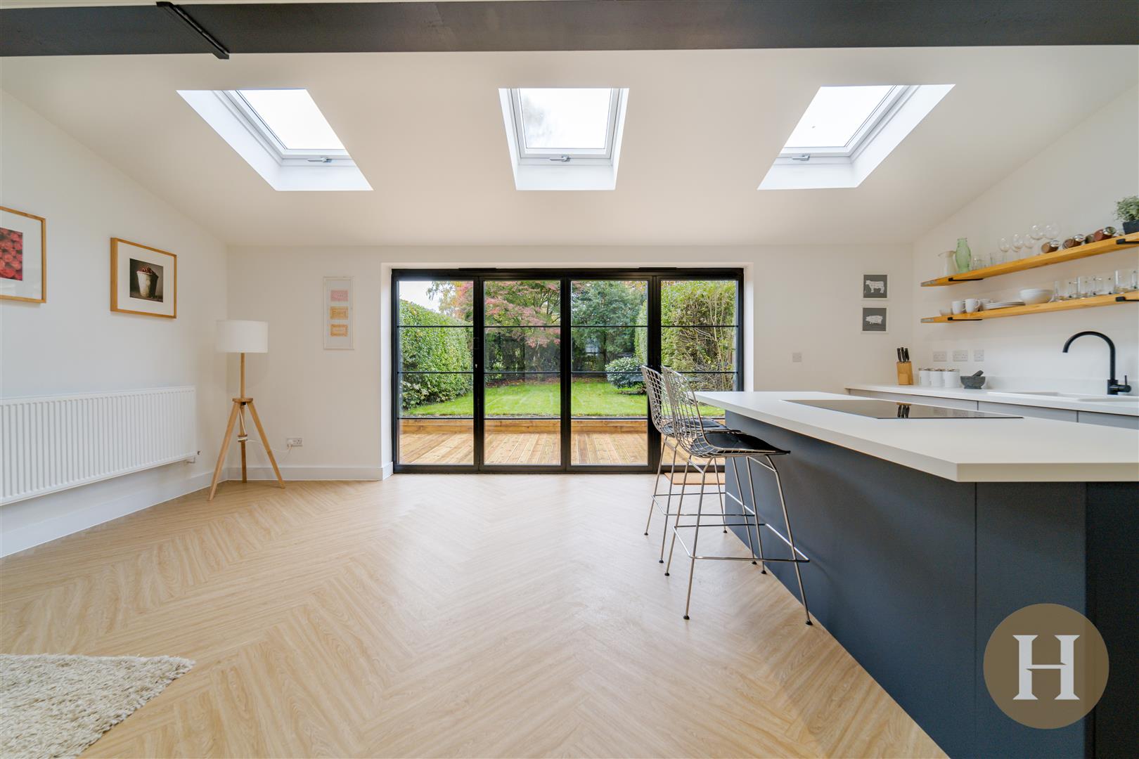 Kitchen Diner - Herringbone wood flooring, ceiling spotlight points, radiators, aluminium bifold glass door to rear elevation, three skylights, kitchen island with seating and integrated electric hob and integrated appliances.