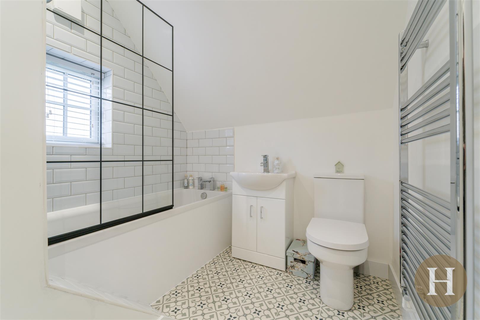 Family Bathroom - Tiled flooring, two double glazed window to side elevation, part tiled walls, heated towel rail, sink unit with underneath storage, bath with shower over and low flush W.C