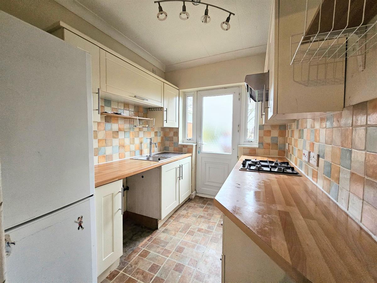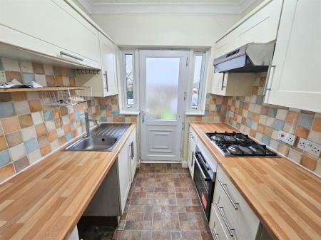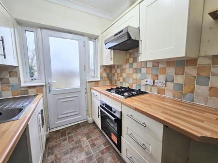 Fitted with a range of wall and base mounted units, roll edge work surfaces, inset stainless steel single drainer sink unit, splashback tiling, integral oven, hob and extractor hood (the agent has not tested appliances, space for a tall standing freezer, plumbing for a washing machine, ceiling light point, UPVC double glazed door leading out to the rear garden.