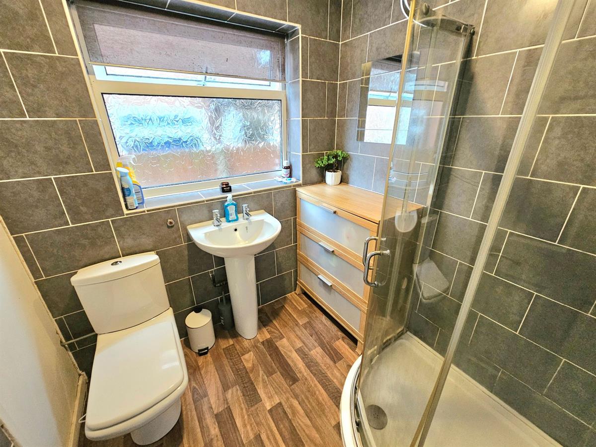 Modern refitted shower room having rear aspect double glazed window, walk in shower cubicle with electric shower over, wash hand basin and low level WC. Tiled walls and flooring.