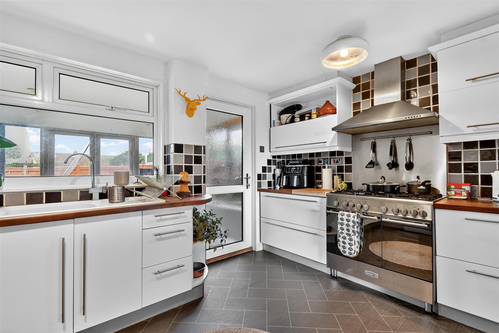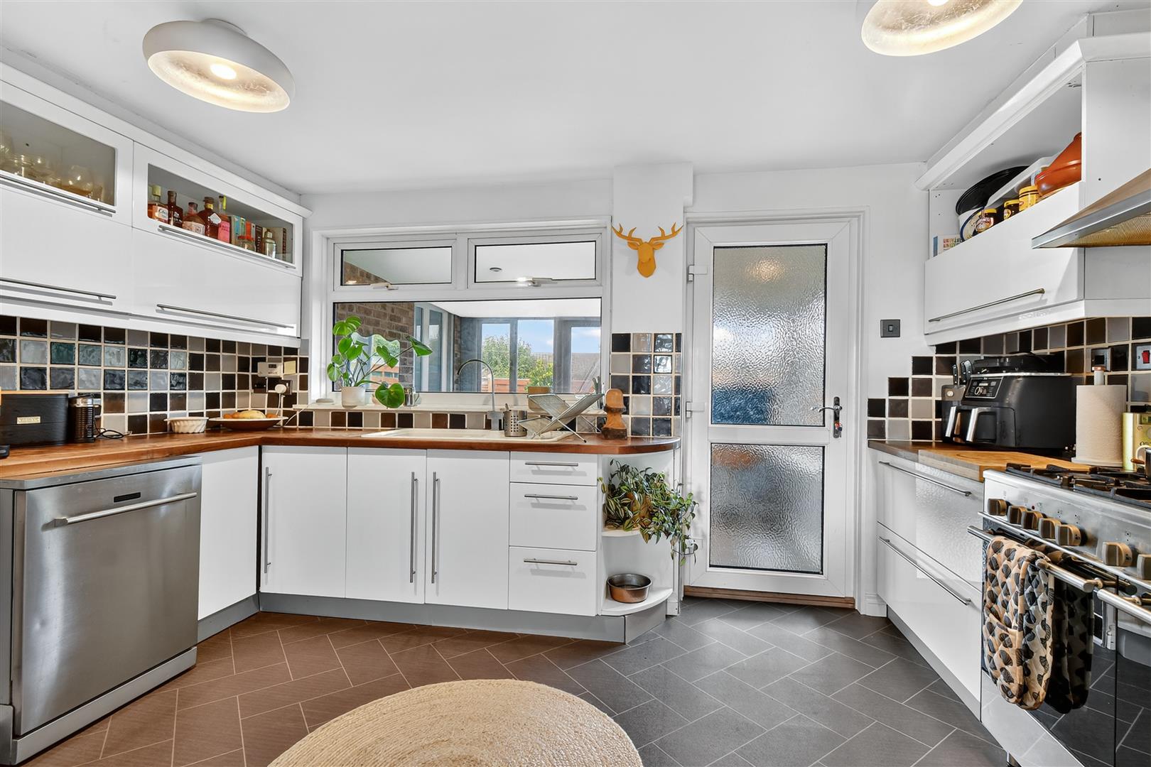 Kitchen - Modern fitted units with base and wall units and work surfaces, window to rear. Door to