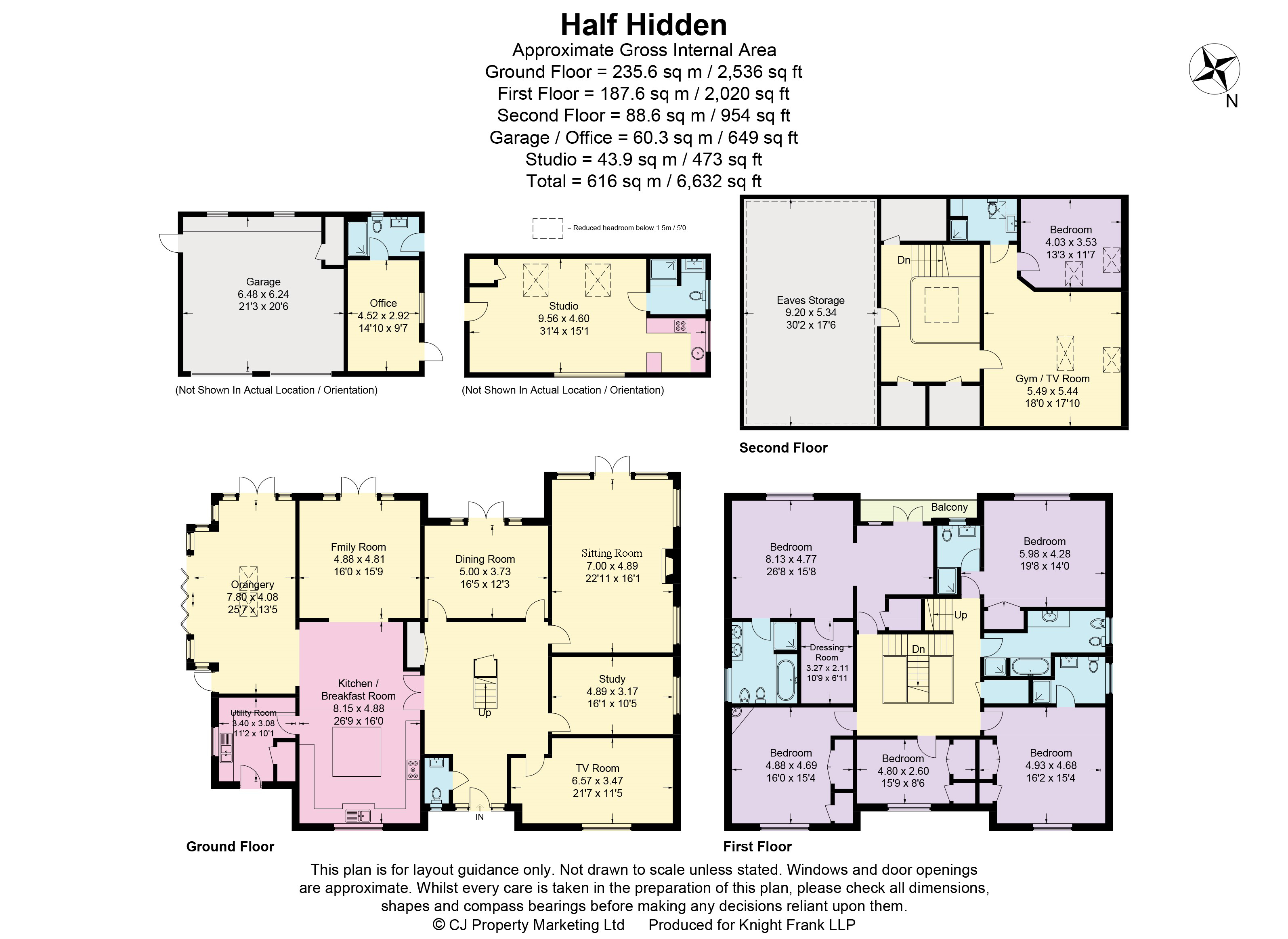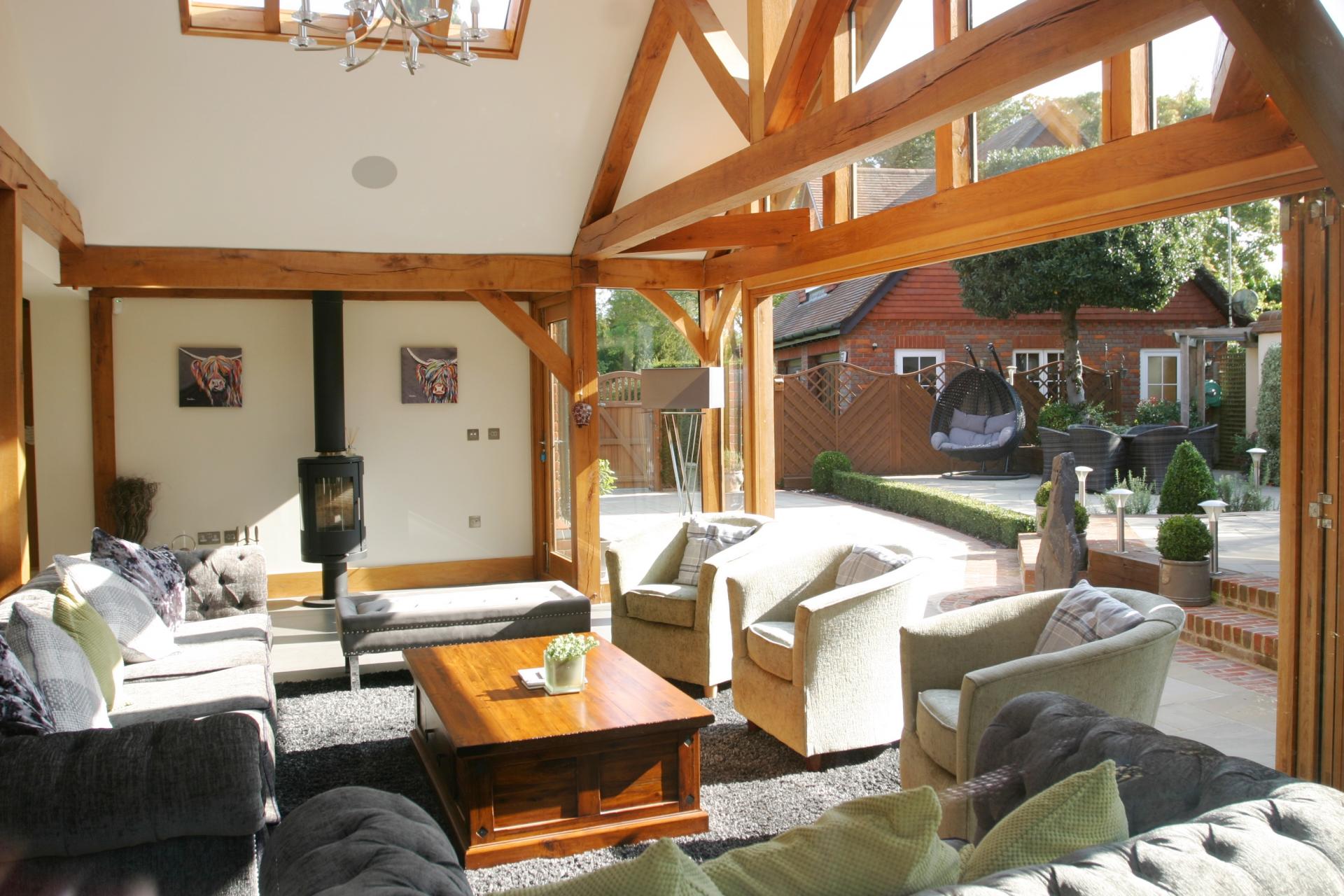 Outbuildings: the detached garage block has a separate office with shower room (also accessible from the external dining area) and self contained studio above, with kitchen area and further shower room.