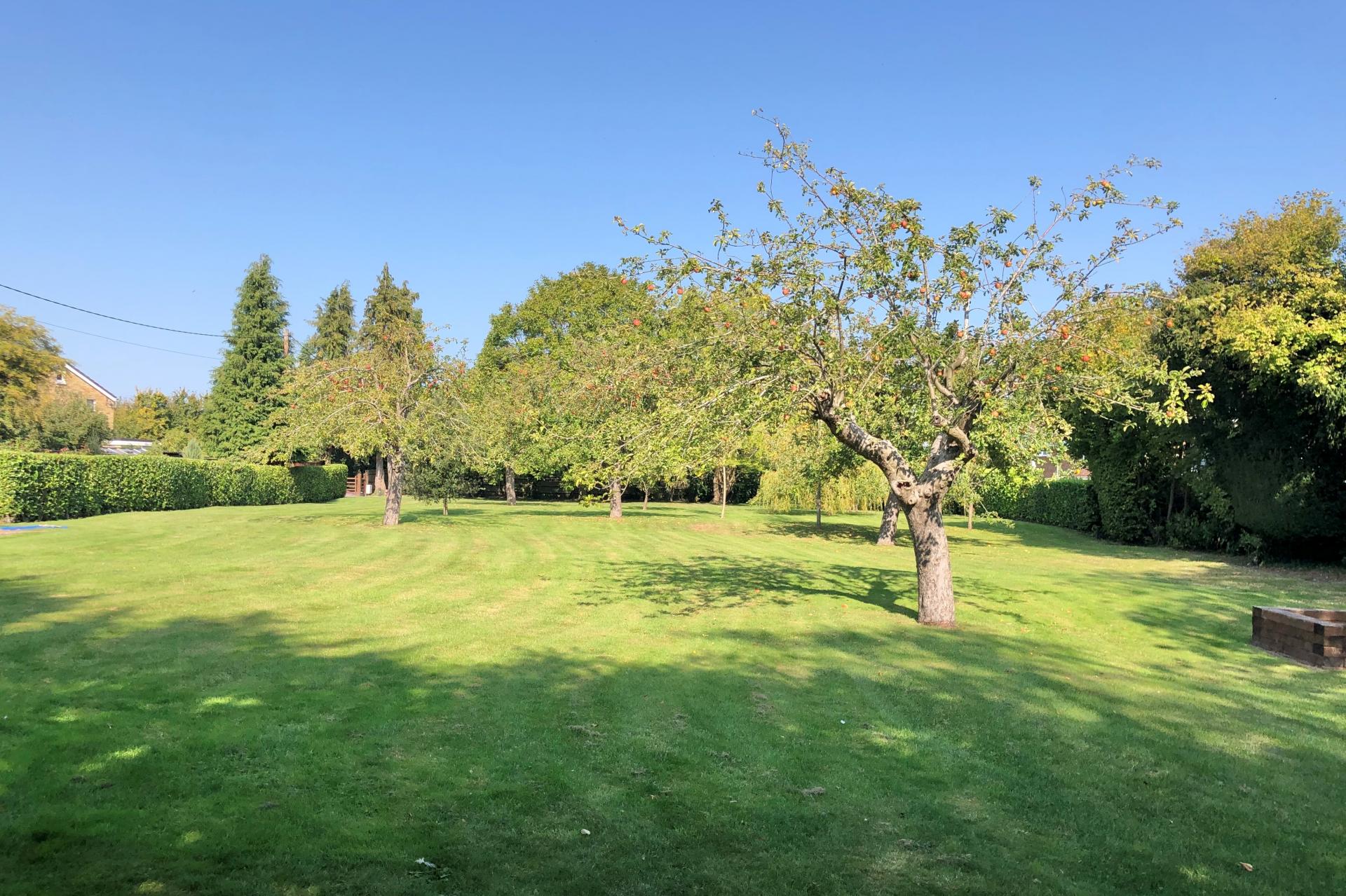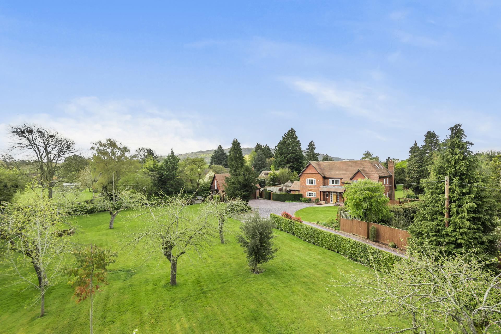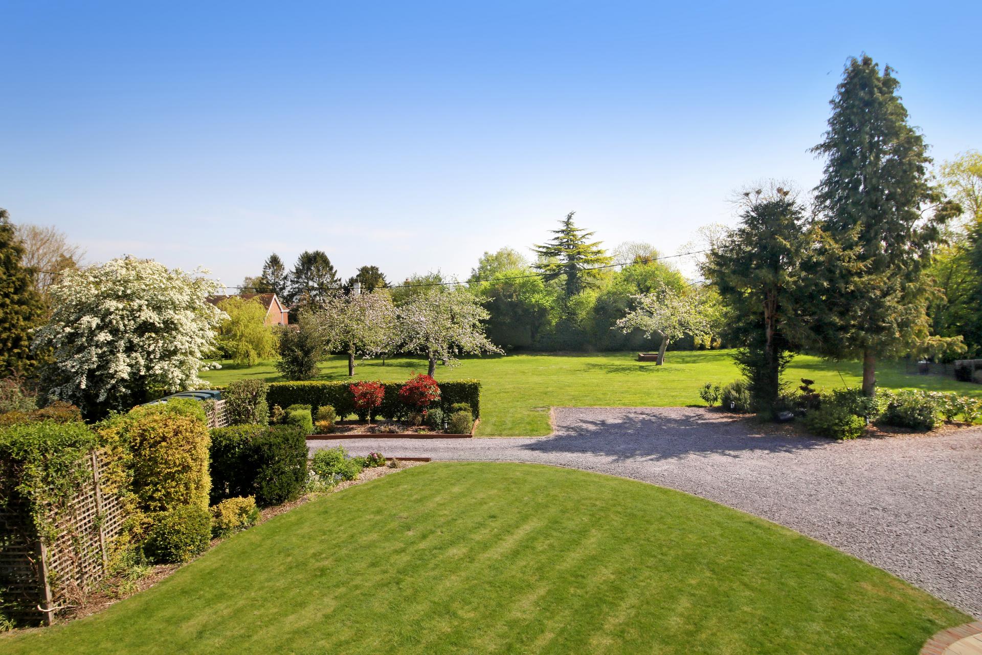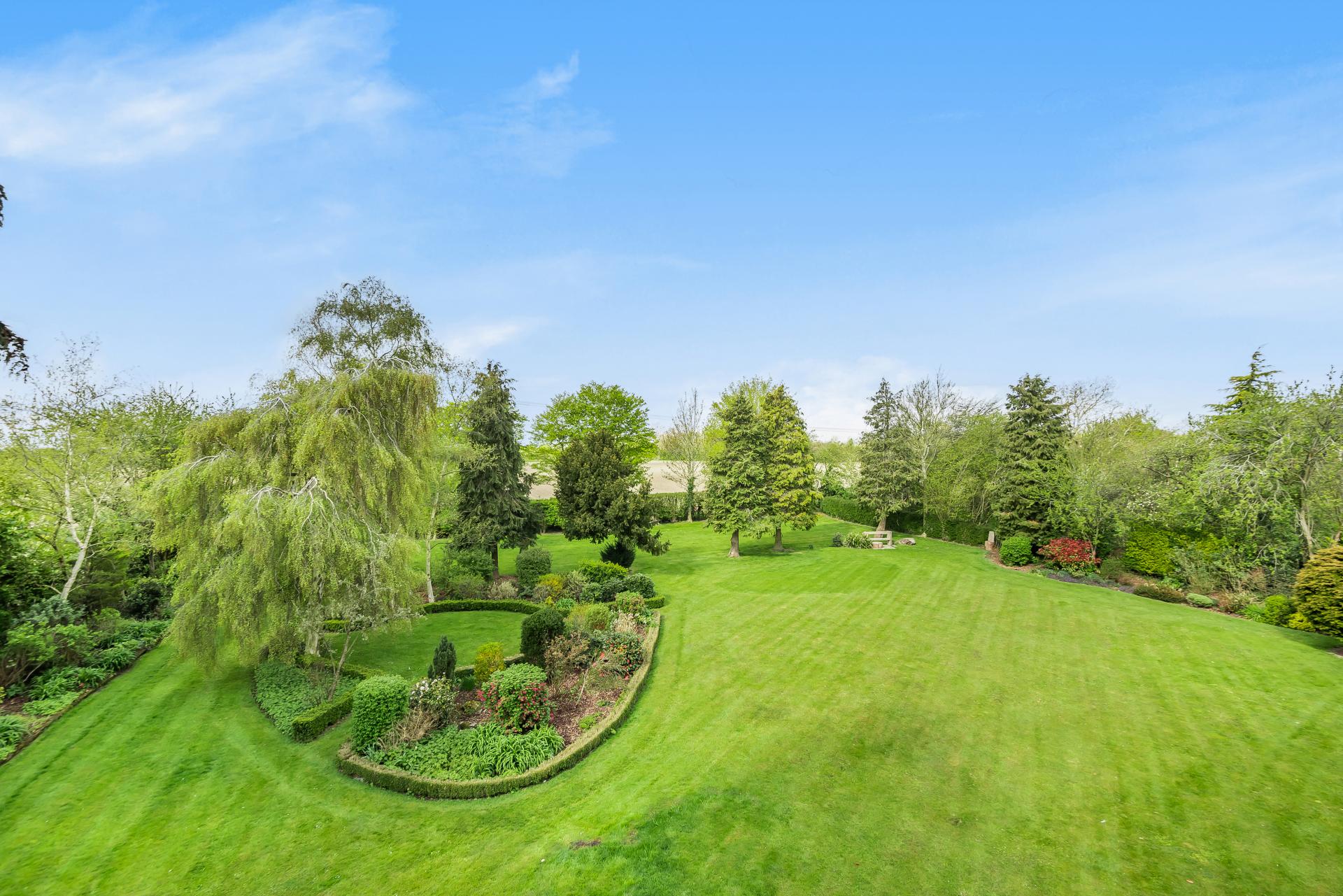 The house and grounds, 1.5 acres in all, are accessed via a private driveway with an intercom and electric wooden gates, opening onto the drive which sweeps past the house and leads to the detached garage block. The established well stocked gardens wrap around the house, with orchard style planting at the front with apple trees and mature hedging. The gardens to the rear have rolling lawns with attractive terraces, island beds and borders, along with the covered patio area adjacent to the orangery.