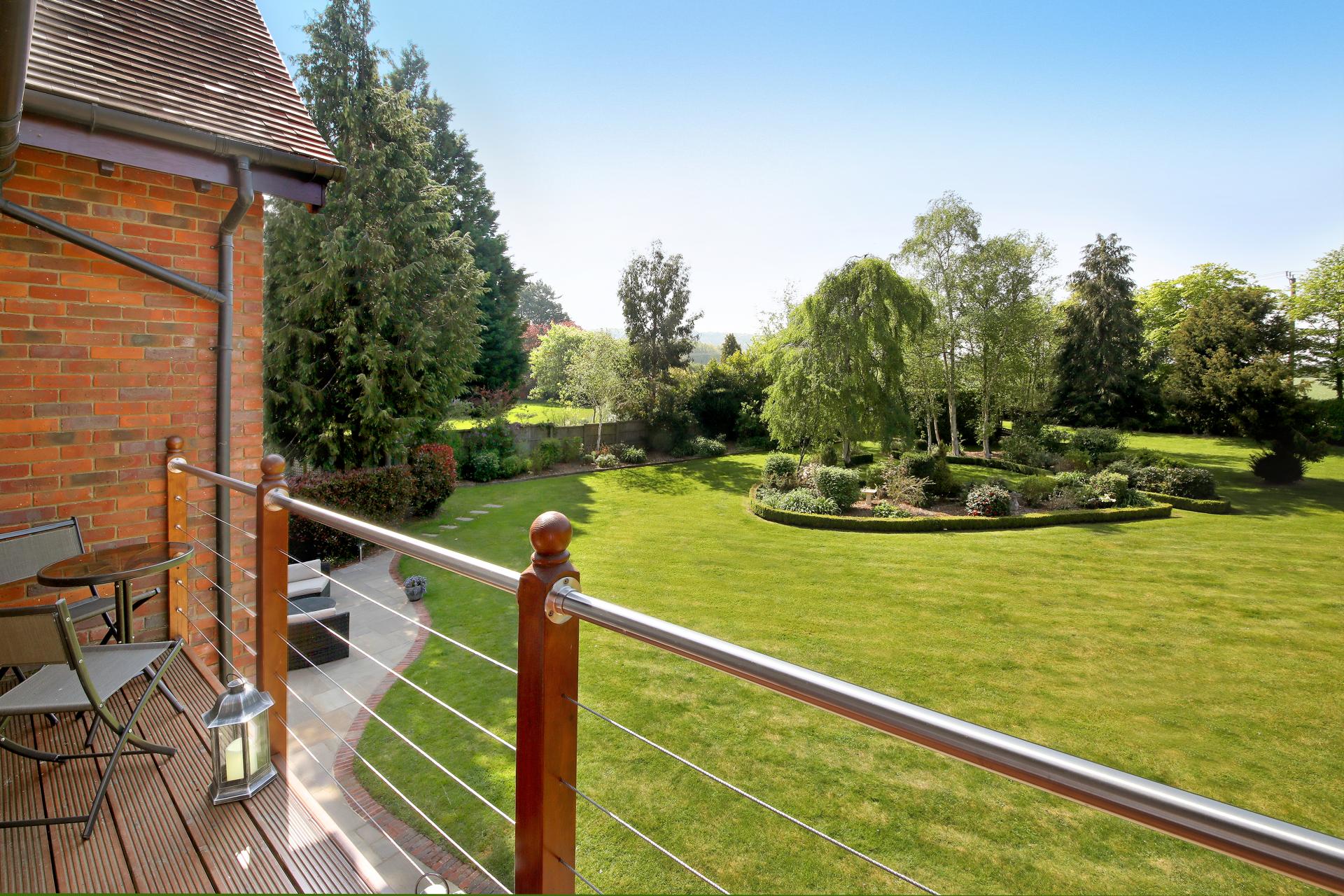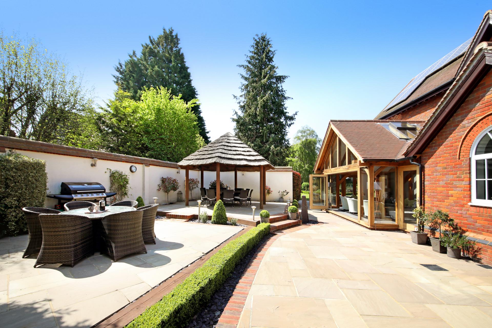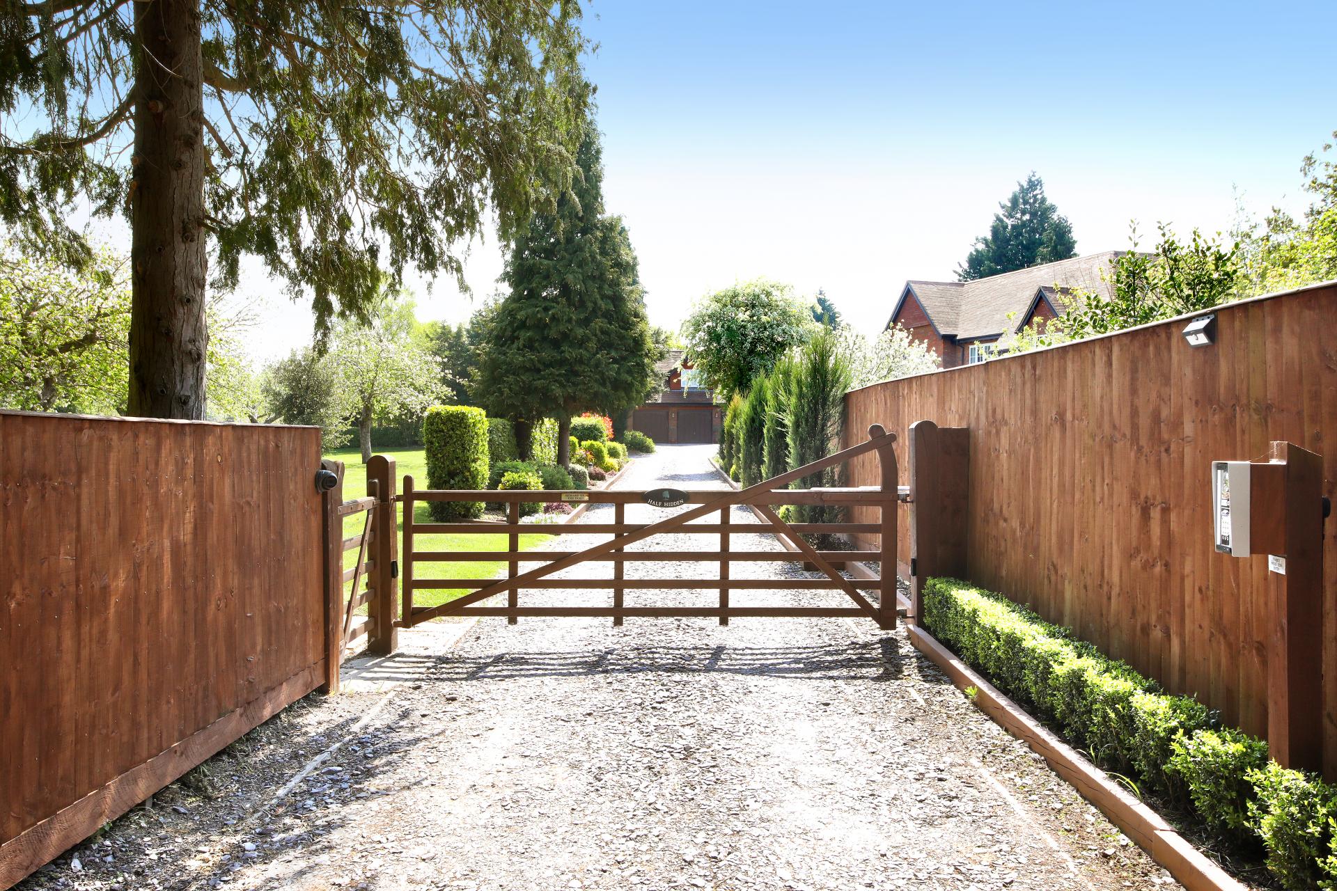 The house and grounds, 1.5 acres in all, are accessed via a private driveway with an intercom and electric wooden gates, opening onto the drive which sweeps past the house and leads to the detached garage block. The established well stocked gardens wrap around the house, with orchard style planting at the front with apple trees and mature hedging. The gardens to the rear have rolling lawns with attractive terraces, island beds and borders, along with the covered patio area adjacent to the orangery.