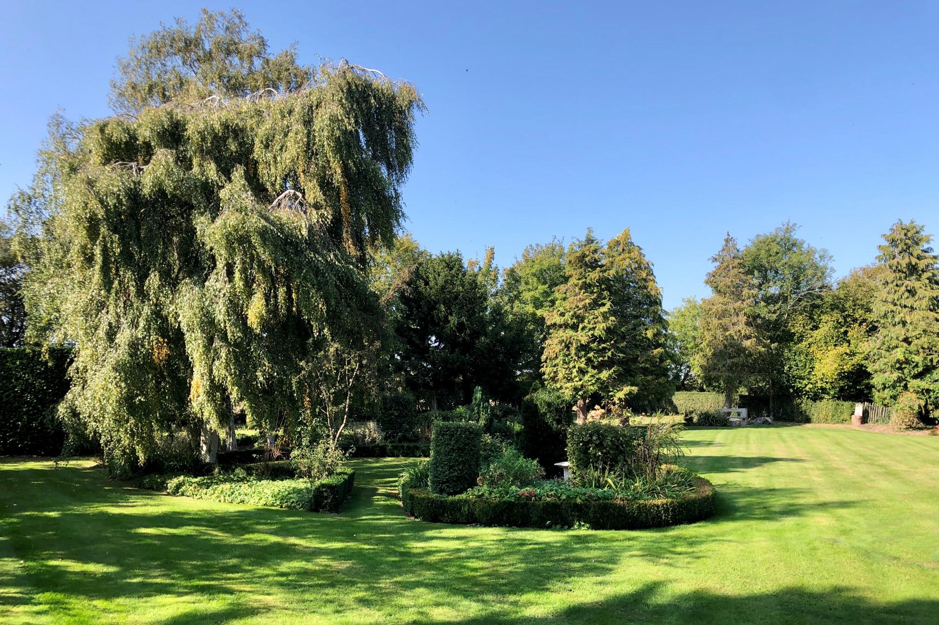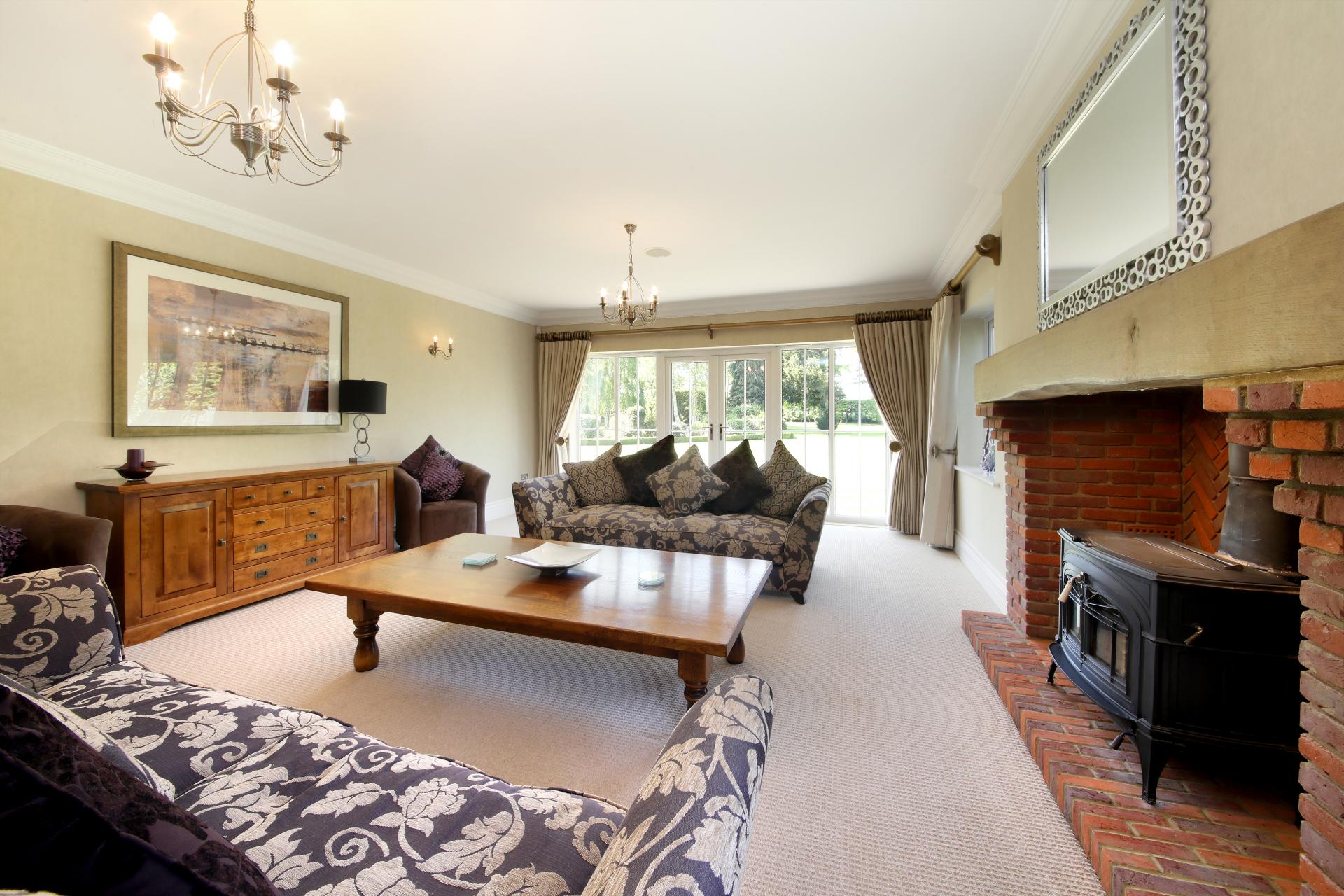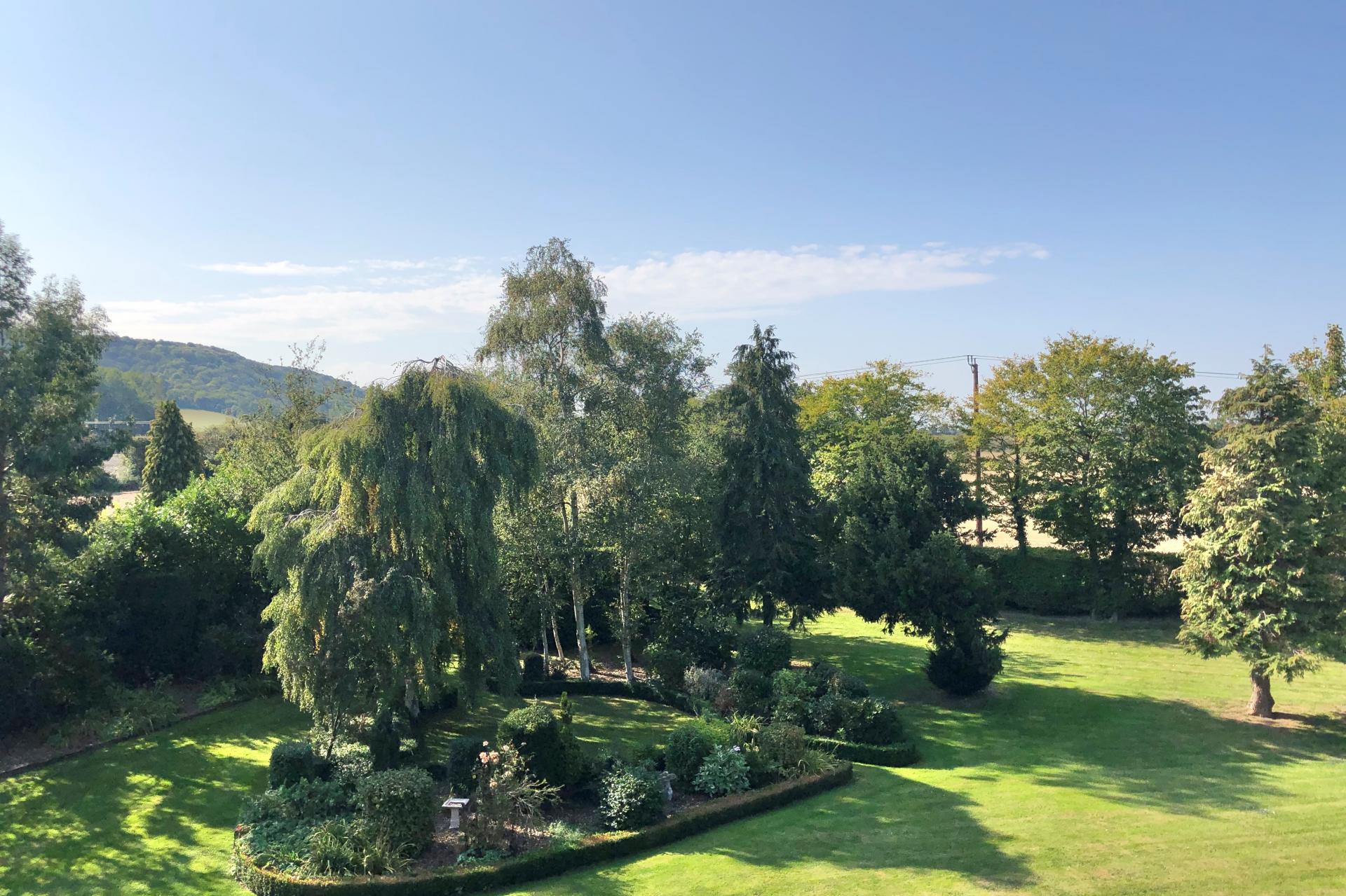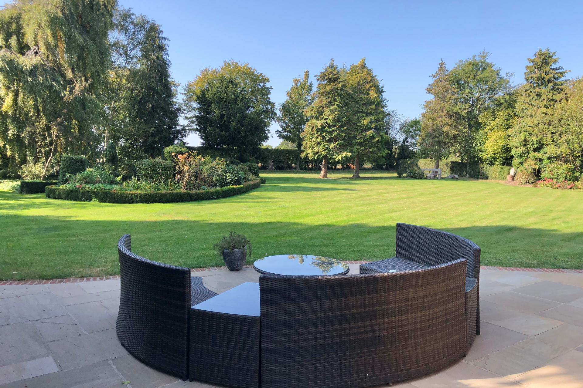 The house and grounds, 1.5 acres in all, are accessed via a private driveway with an intercom and electric wooden gates, opening onto the drive which sweeps past the house and leads to the detached garage block. The established well stocked gardens wrap around the house, with orchard style planting at the front with apple trees and mature hedging. The gardens to the rear have rolling lawns with attractive terraces, island beds and borders, along with the covered patio area adjacent to the orangery.