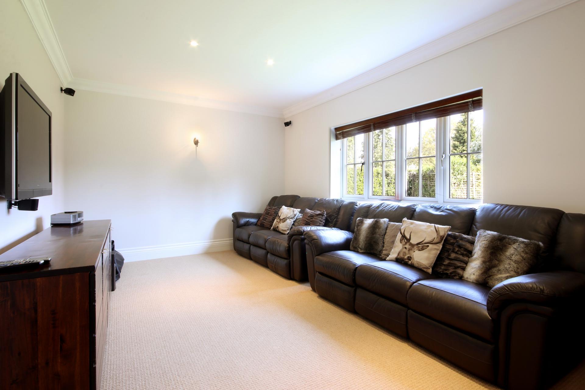 Upon entering the house there is a grand lobby area with tiled floor and majestic central staircase spanning three floors and the principal reception rooms lead off. At the front of the house is a cloakroom, tv room, study, and stunning 26' kitchen/breakfast room, with utility room off, and bespoke orangery with bifold doors opening out onto an exterior space with thatched covering for alfresco dining. The kitchen area has a central island, base and eye level fitted cabinets with integral appliances under granite worktops. The breakfast room leads into a family room which opens out onto the expansive rear gardens. A dining room is situated at the rear of the lobby with an adjacent sitting room next door, both have french doors. The accommodation is light filled and well appointed throughout. The first floor contains the vaulted ceilling master suite, with dressing room, ensuite, seating area and balcony overlooking the rear gardens. In addition there are a further four bedrooms, two with ensuites and all with built in closets and the family bathroom. The second floor houses bedroom six, with a shower room, a gym/TV room and 30' eaves storage area.