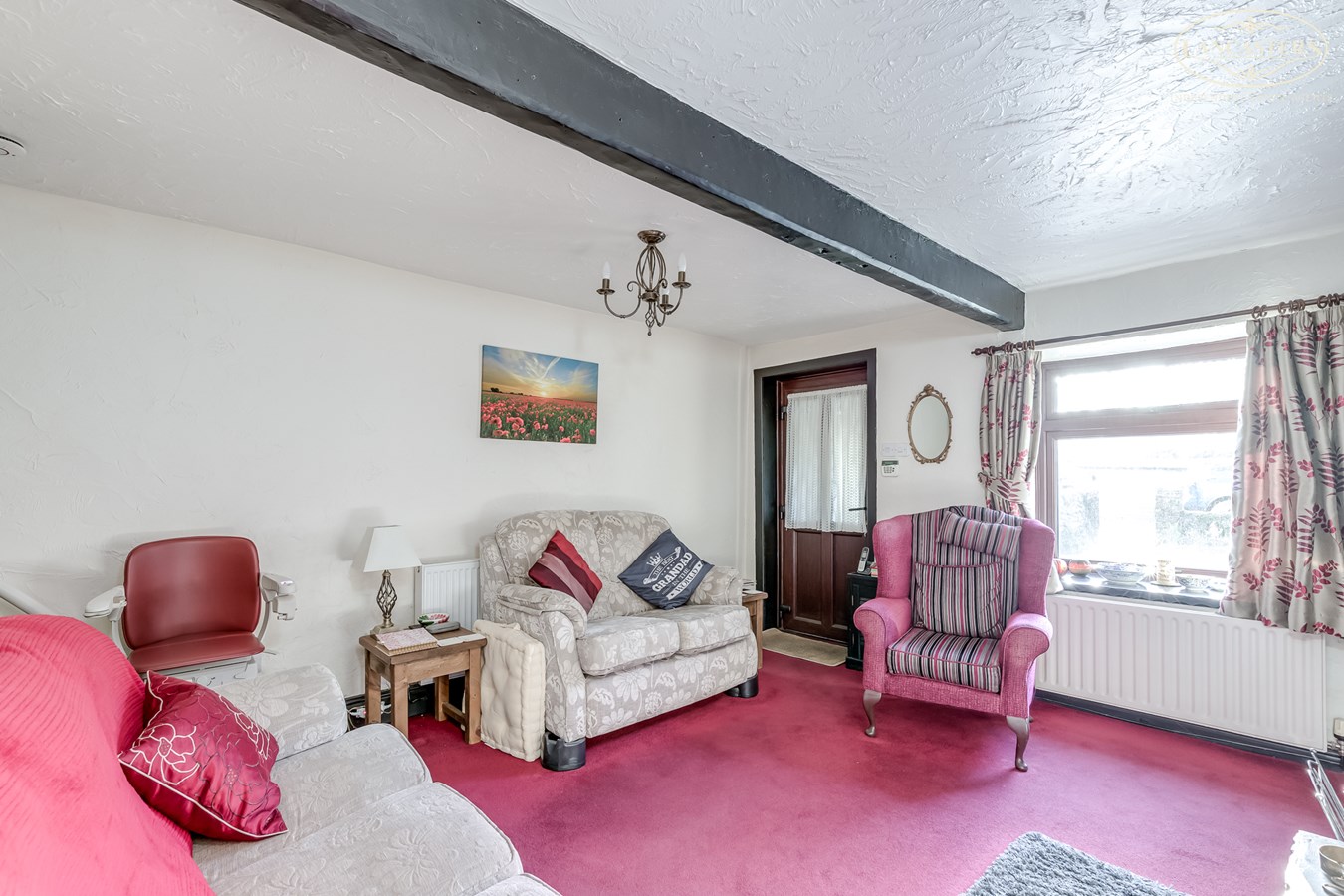 - Character features including exposed beams and an open fireplace