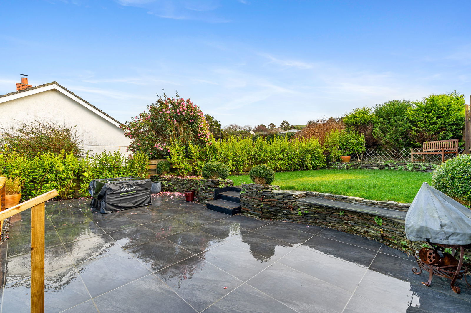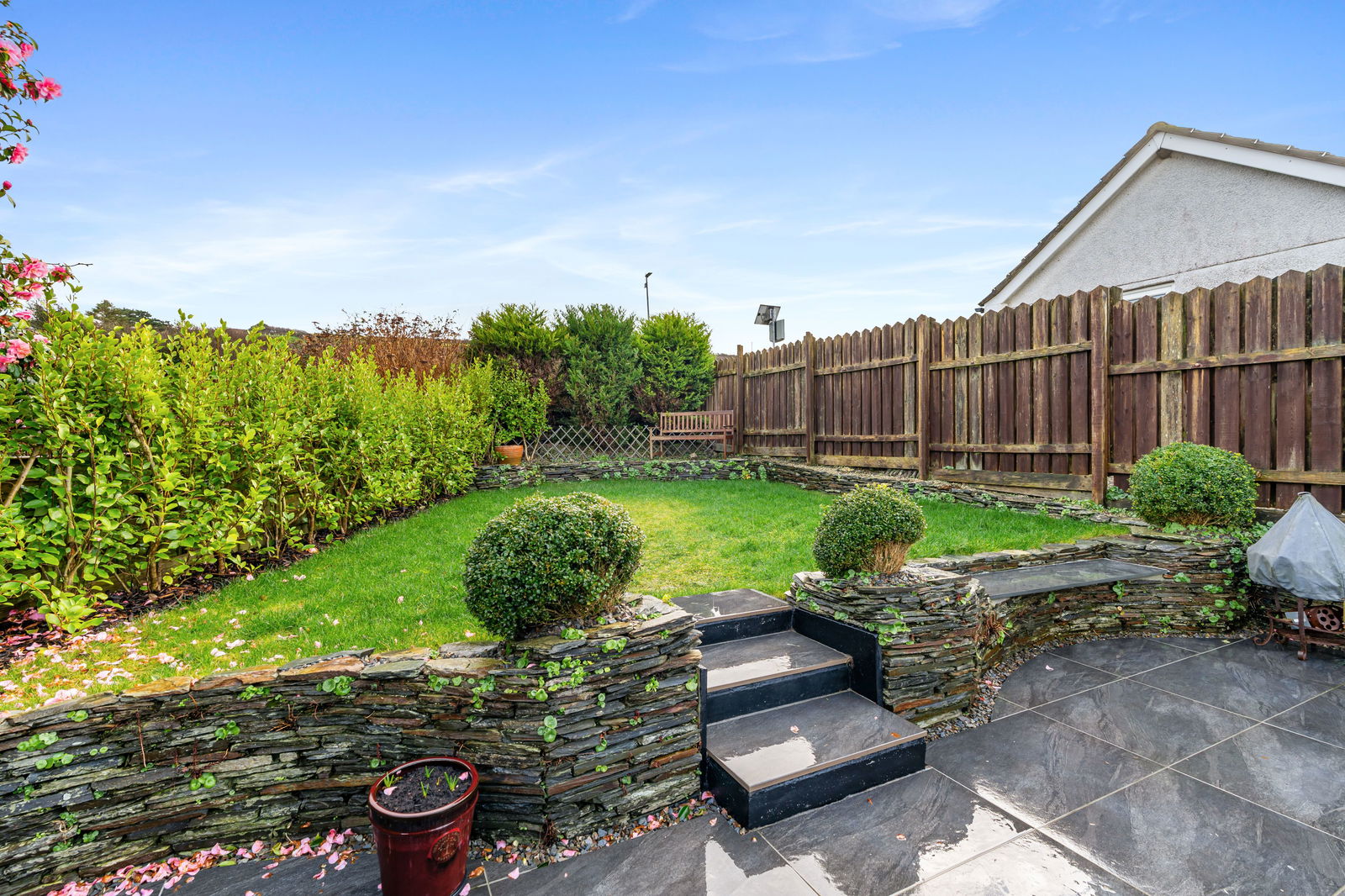 With 2 large planters and a lovely range of shrubs and plants with path round to side door.  Outside tap.  Raised decking with great views across to the church and sea beyond.  Another large planter once again beautifully filled with plants and shrubs.  Steps leading down to an area with storage sheds and wood store.