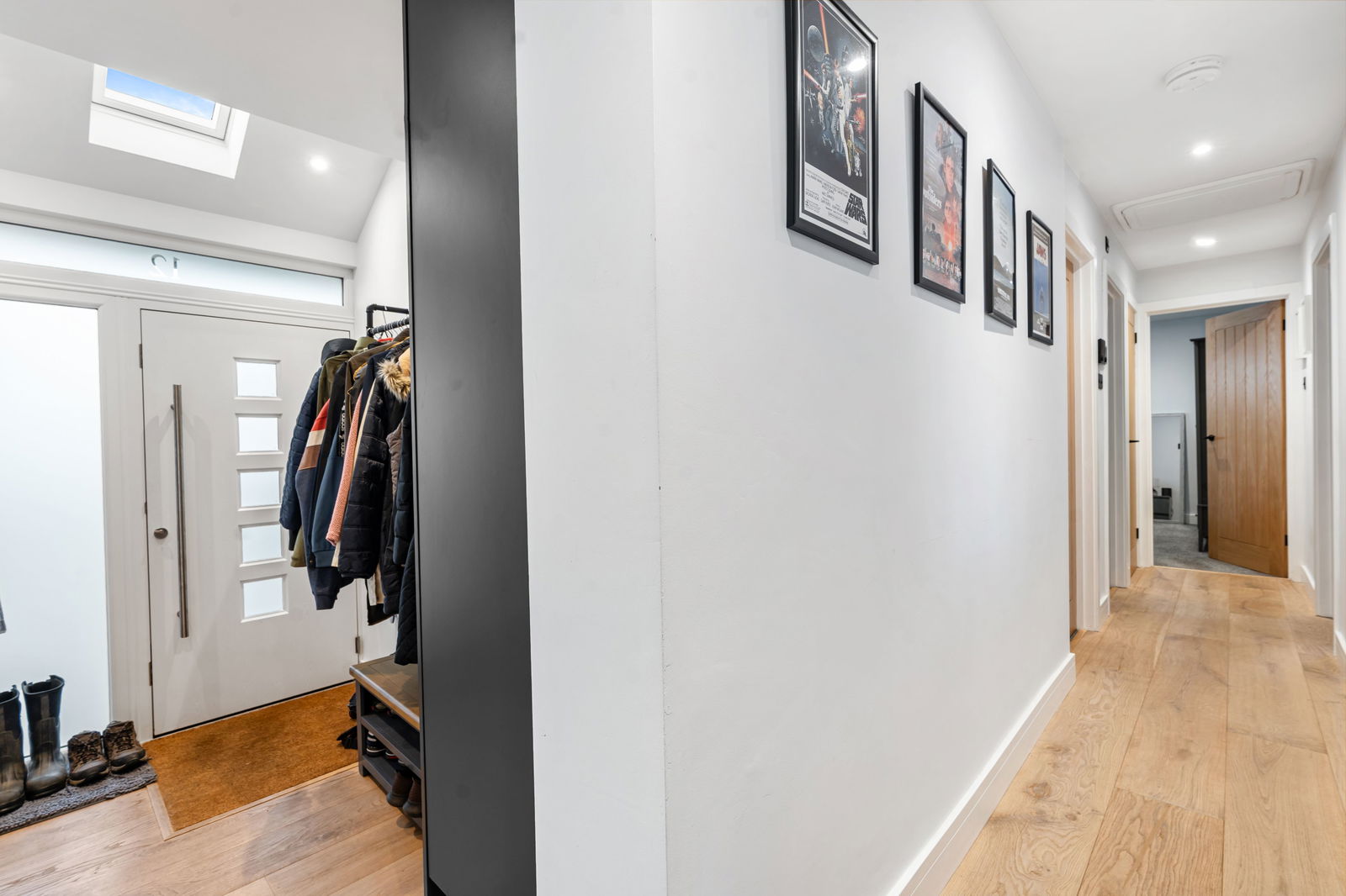 Large cloaks hanging space with double glazed Velux window above.  Large fitted cupboard with shelving above providing excellent storage.  Airing cupboard with shelving.  Loft hatch.  Radiator.  Engineered Oak flooring.    Oak door through to