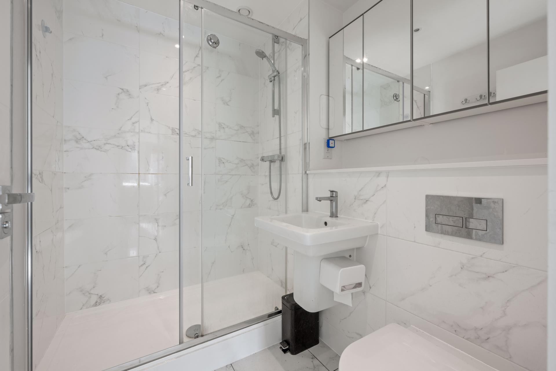 elegant marble-effect tiles, a walk-in shower, a WC, a raised sink, and mirrored storage units.