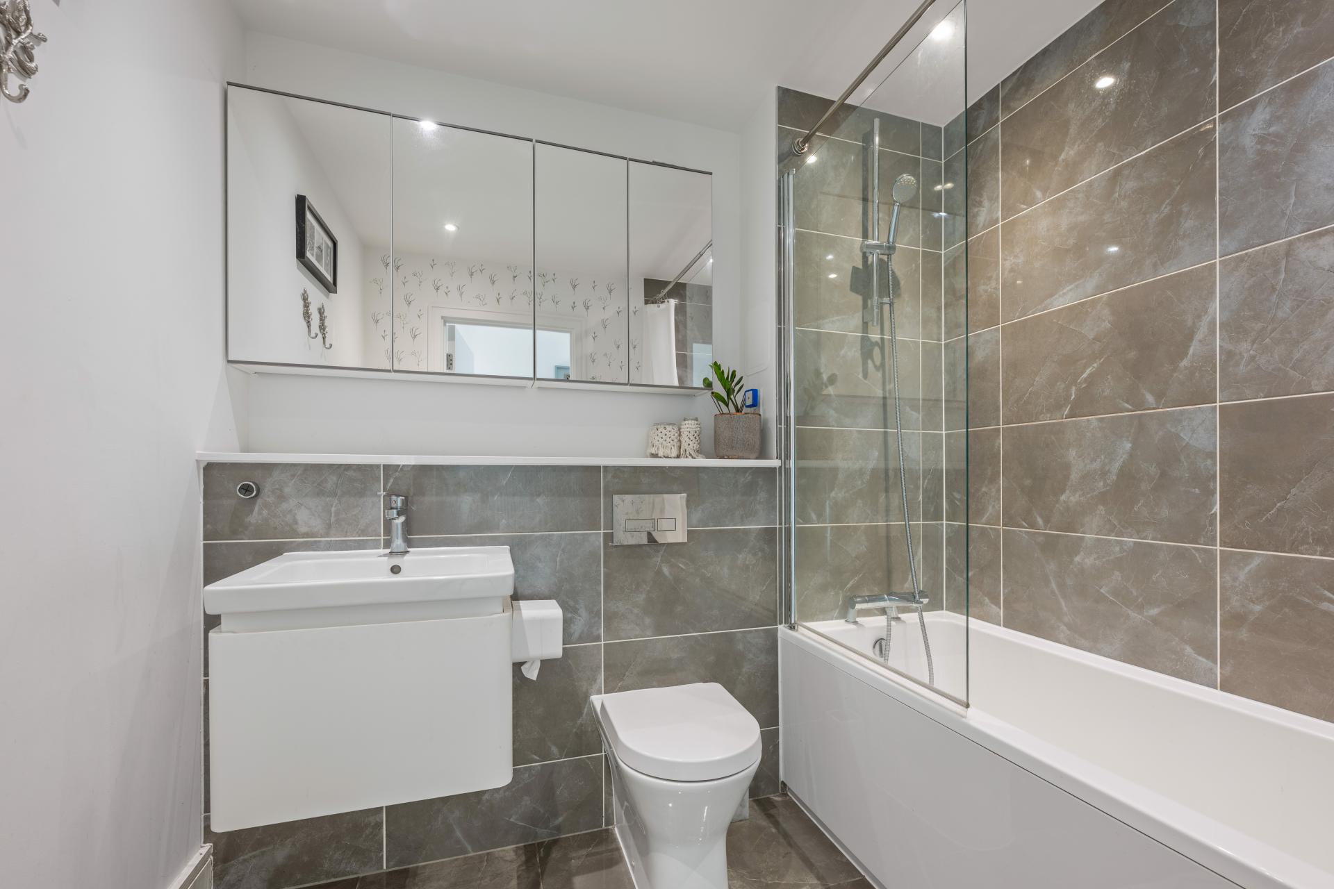 The main family bathroom continues the modern aesthetic, fully tiled and boasting a luxurious