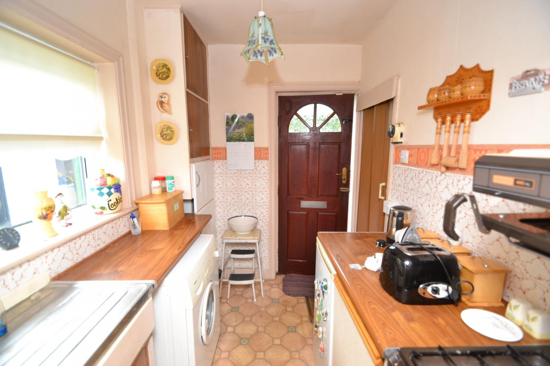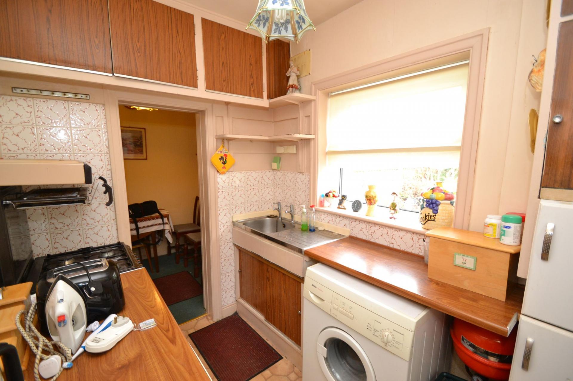 Kitchen: 2.55m x 1.86m (8'3 x 6'1). Range of wall & base units, work top with tiling above, stainless steel sink, plumbed for an auto-washer, piped for a gas cooker, space for a fridge, side door, condensing combi-boiler, pantry cupboard.