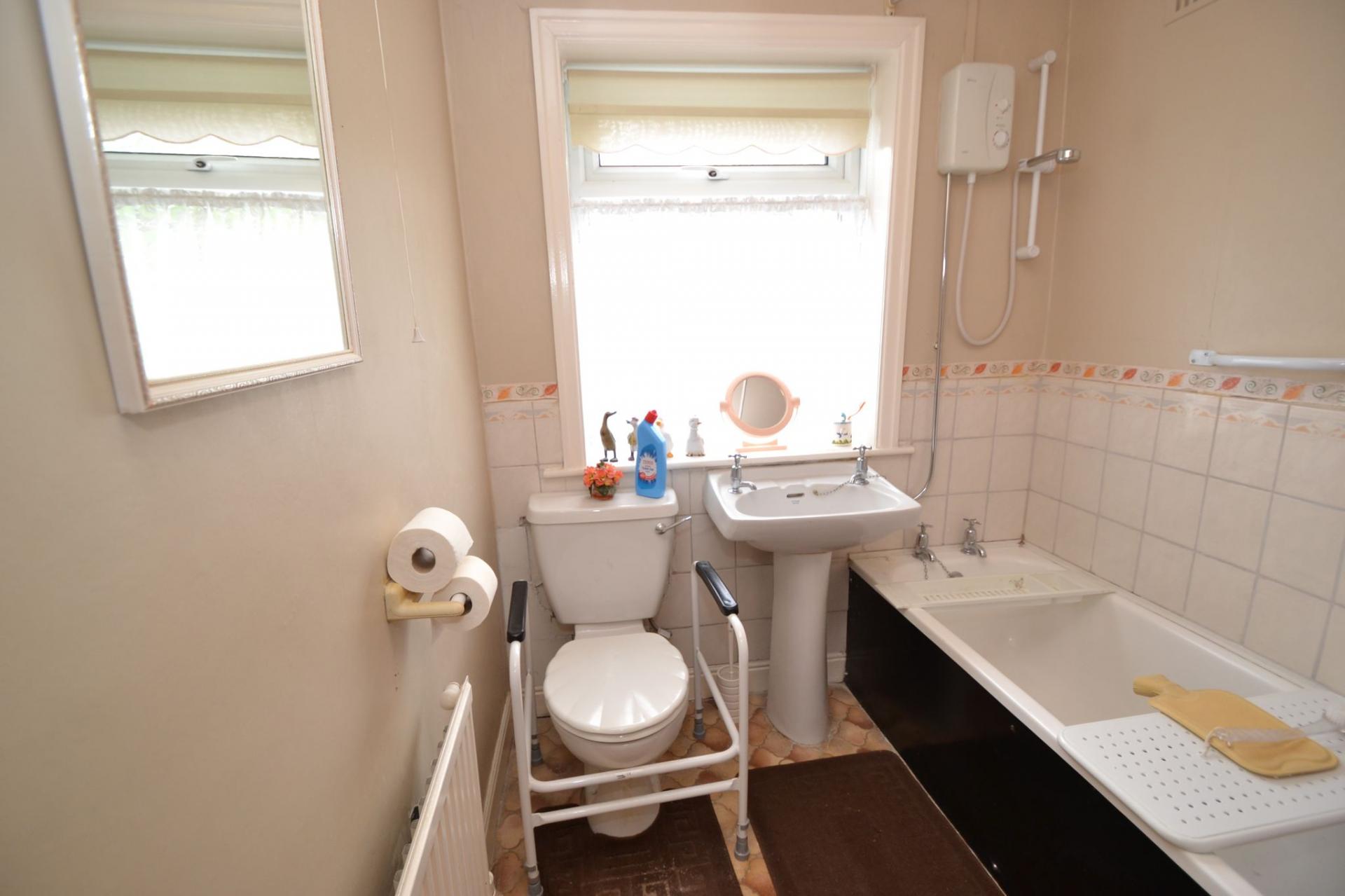 Bathroom: 2.18m x 1.87m (7'1 x 6'1). Three piece suite in white, shower rail and curtain with an electric shower over the bath, frosted Upvc dg window, part tiled to walls, radiator.