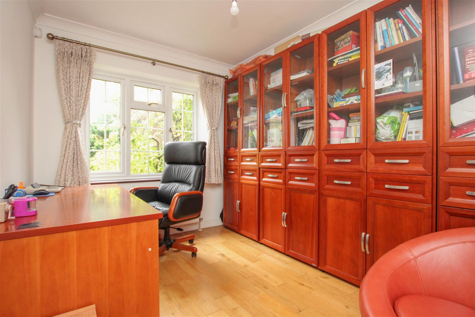 A good sized, fully enclosed porch leads to the light and airy entrance hall with tiled floor, understairs storage cupboard and door to the ground floor cloakroom. The large sitting room has a fire surround and arched half glazed double doors into the dining room, which in turn has French doors leading onto the rear garden. The study is fitted with a range of full height storage cupboards along one wall, and there is also a separate playroom. The kitchen has been fitted with an extensive range of modern wall units with underlighting, base units with work surfaces over and windows to the side and overlooking the rear garden. The utility room offers ample space for appliances and has a window and door to the side.