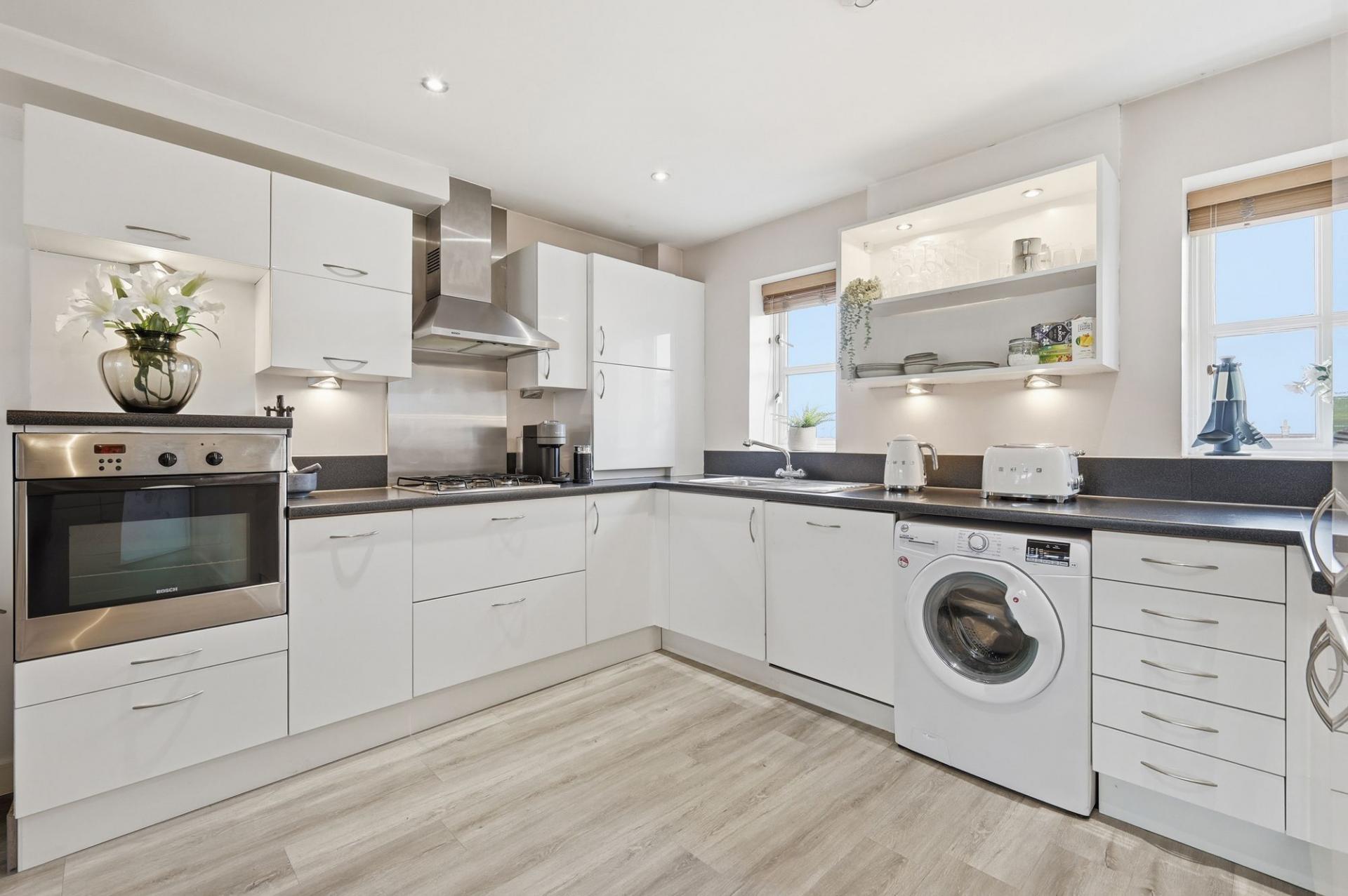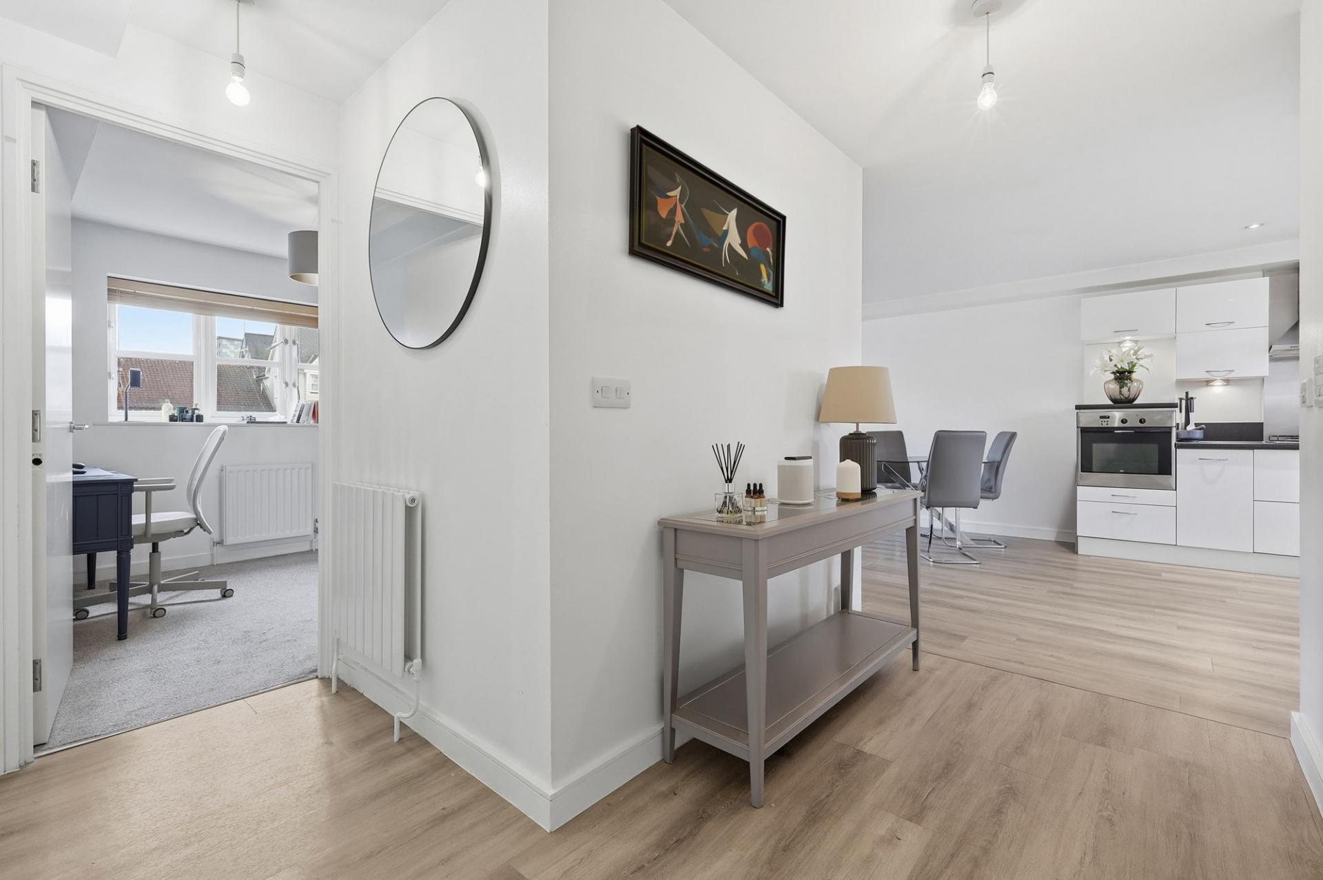 From the moment you enter, it is clear that this apartment has been thoughtfully maintained and tastefully finished throughout. The welcoming entrance hall leads into a spacious open-plan kitchen, dining, and living area, designed to provide both versatility and an inviting atmosphere. Large windows allow natural light to pour in, enhancing the sense of space and creating a warm, contemporary environment perfect for relaxing or entertaining.