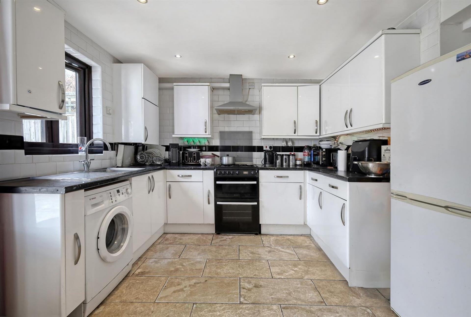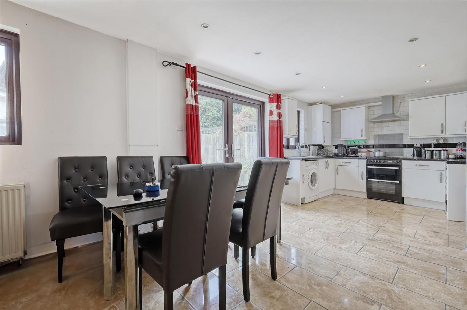 A spacious and open plan area, the kitchen/diner comprises a range of above and below counter storage units, ample worktop space and various integrated appliances. Double patio doors lead out to the rear garden.