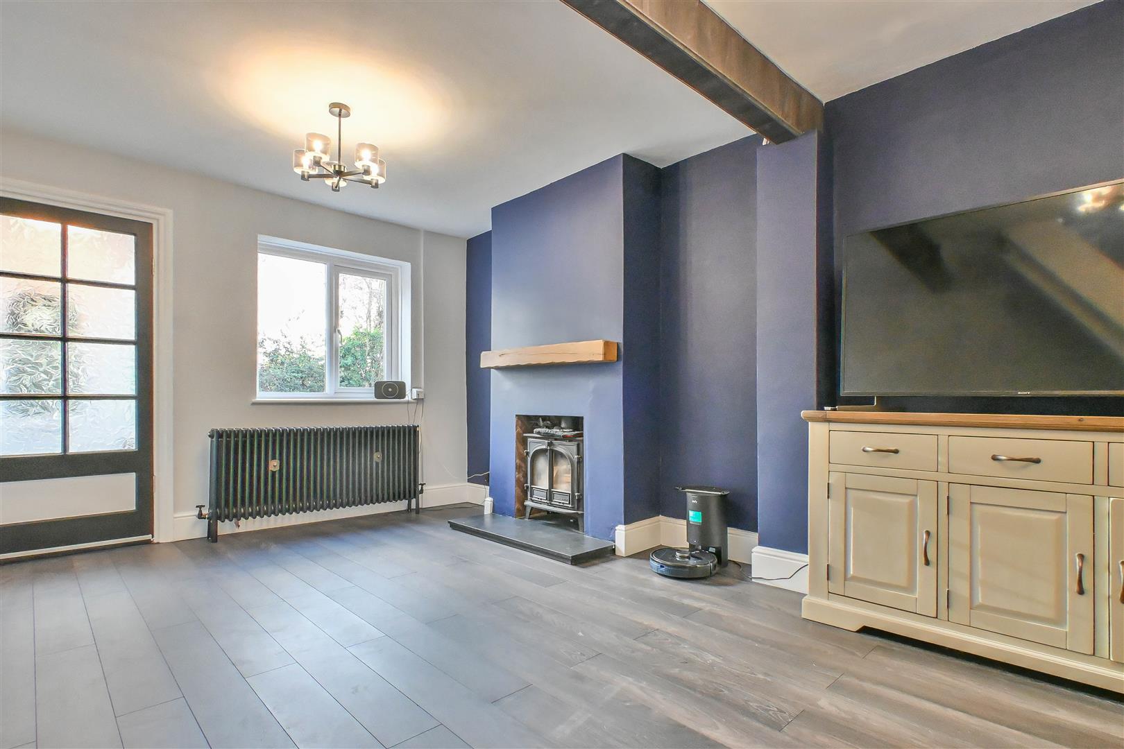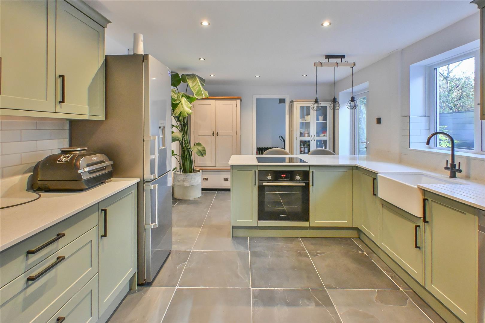 The internal accommodation begins with an inviting porch that opens into a bright and generously proportioned lounge, complete with a wood-burning stove. At the rear of the property, a beautifully appointed kitchen features an array of eye and base level units, ample worktop space, and a classic butler sink. From the adjoining dining area, French doors provide access to the rear garden, along with doors leading to a useful utility room and a ground-floor cloakroom.