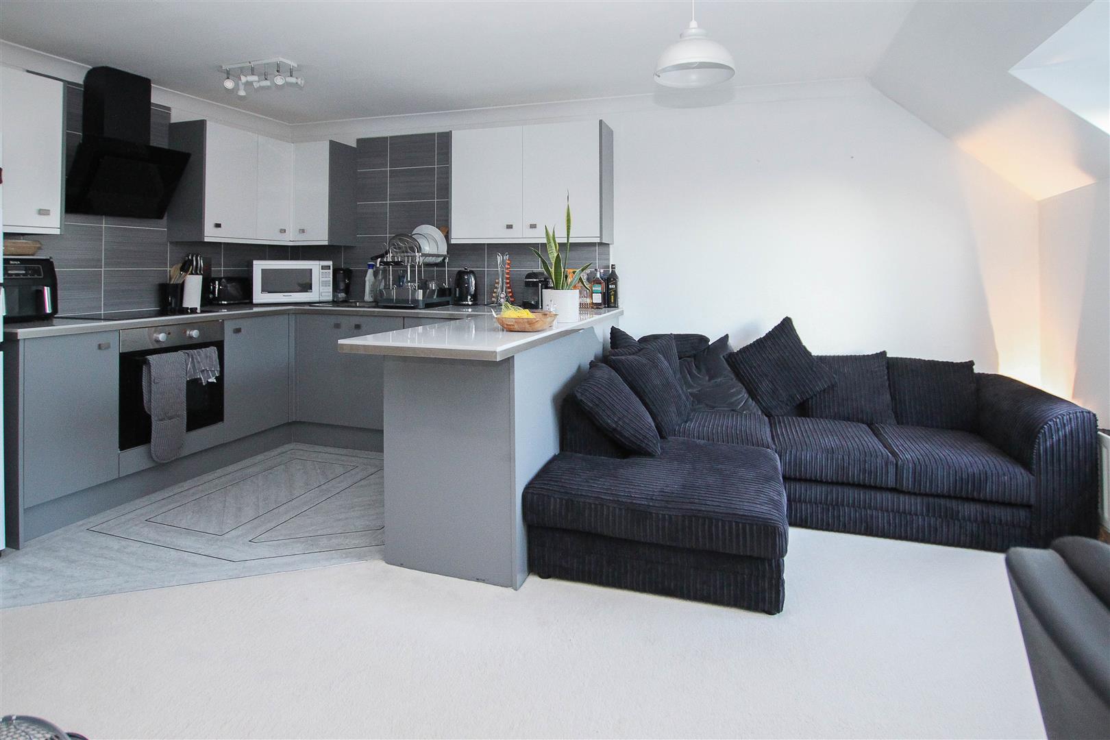 A communal street door with intercom system opens into a communal hallway where you have stairs rising to the first floor, which lead to your private front door opening into a good-sized hallway with doors to all rooms. A spacious open plan living room / kitchen is a bright space offering ample space for relaxing, working from home and cooking. The kitchen is well equipped and has been fitted in a range of modern grey wall and base units with contrasting work surfaces over. There is an integrated oven and hob with extractor above and space for additional appliances.