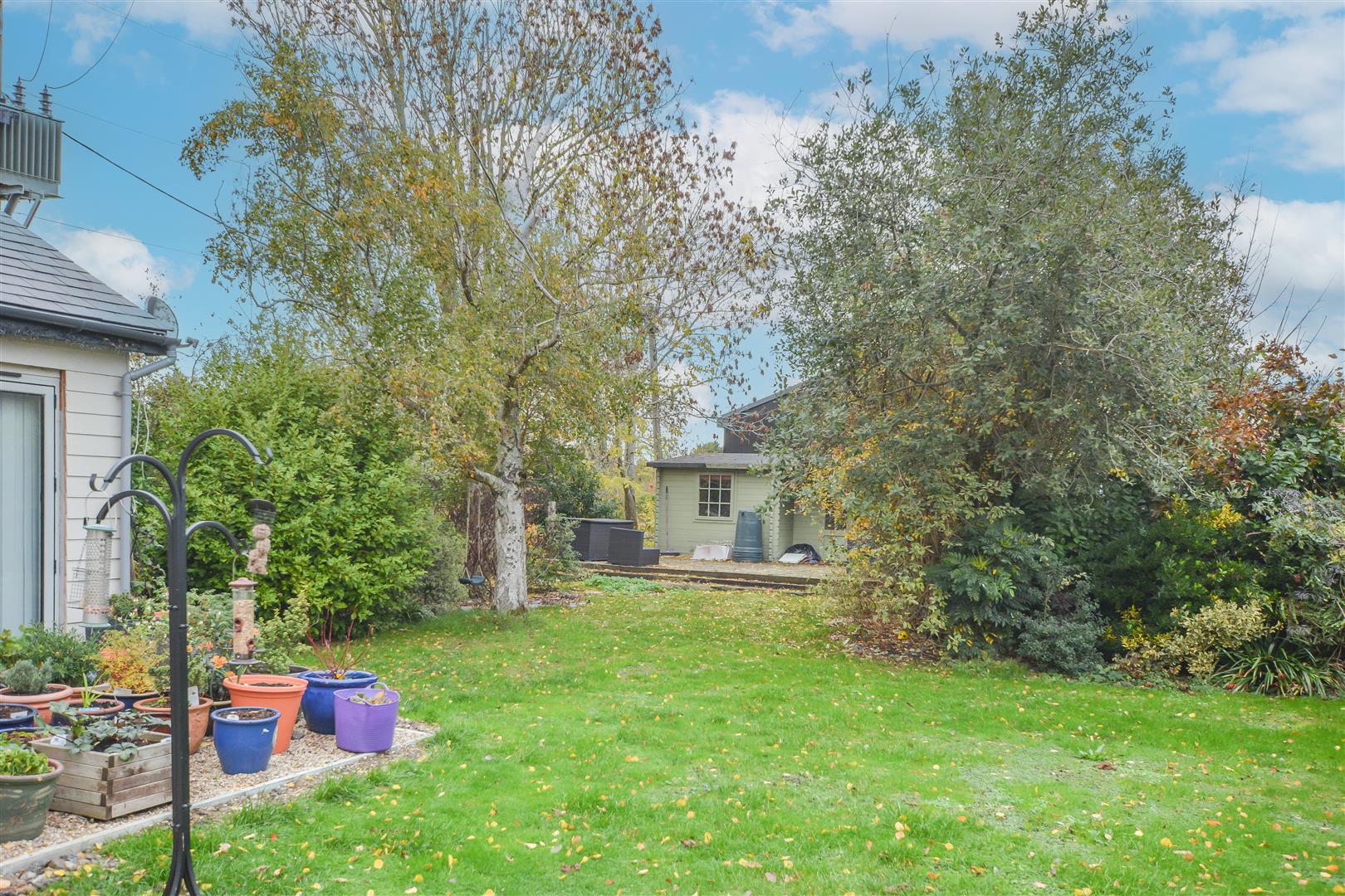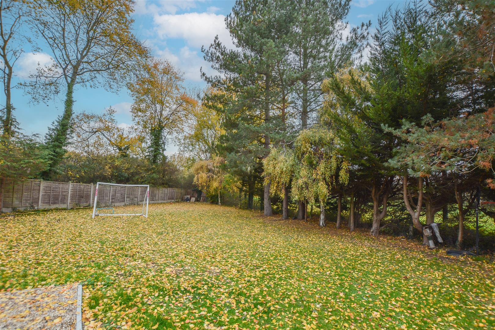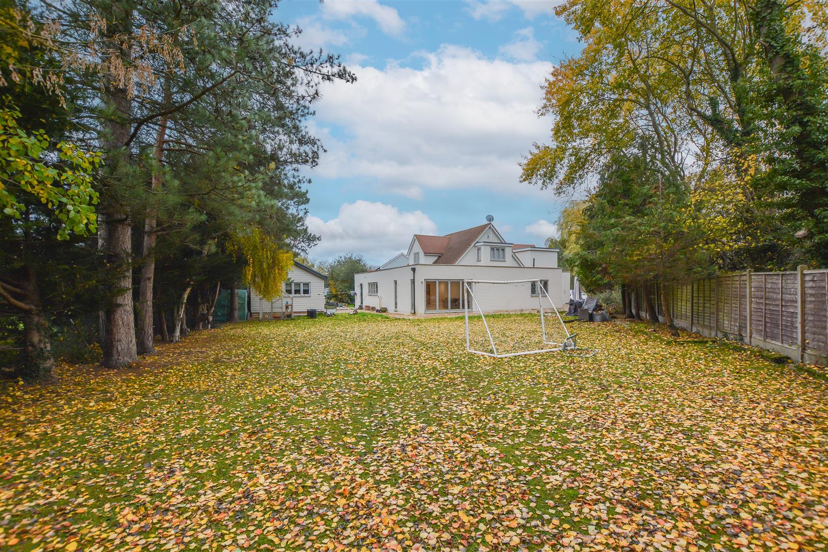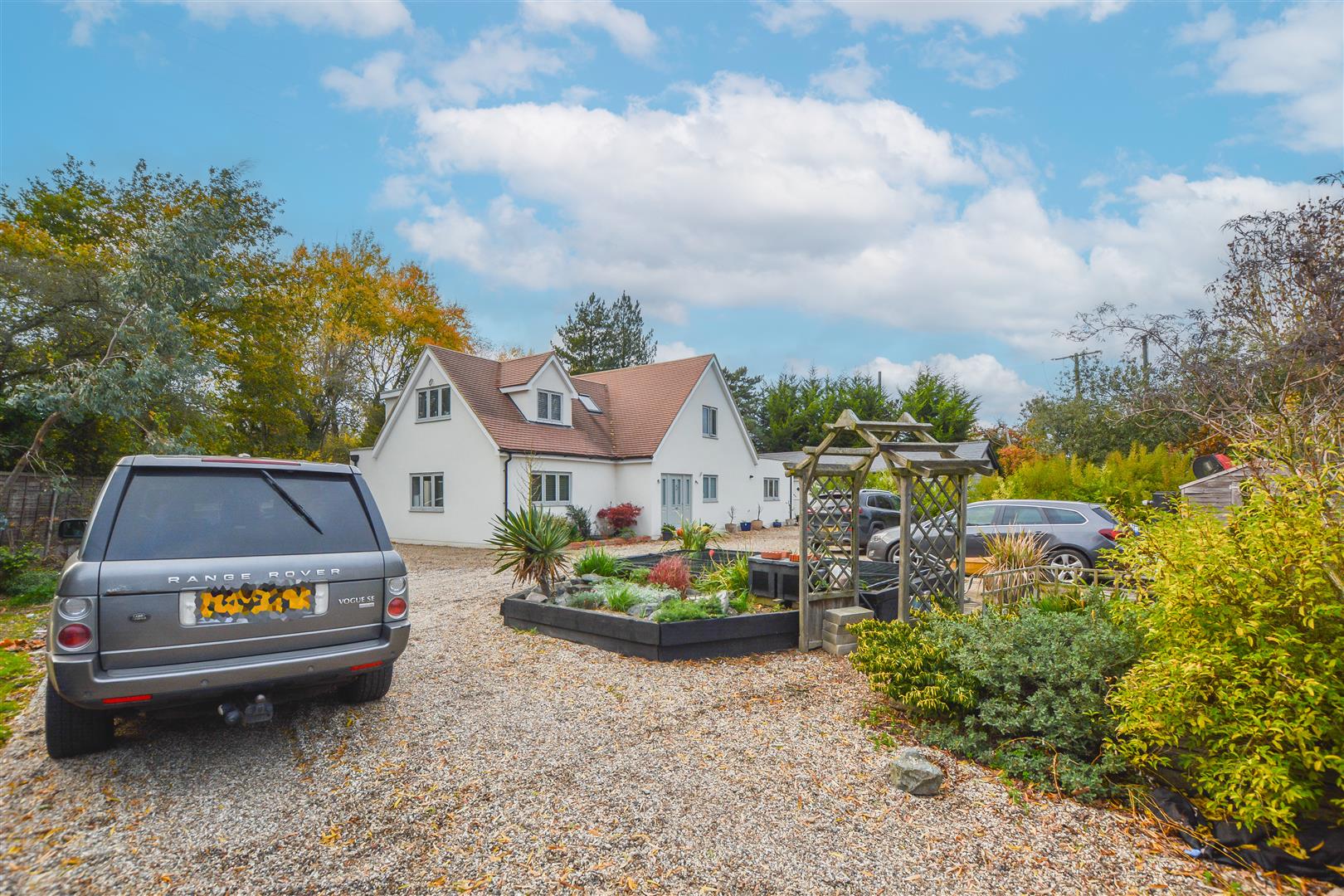 Externally, the property enjoys a generous plot featuring a large rear lawn bordered by mature trees, creating a private and tranquil setting. The front of the home offers a shingled driveway with a raised pond and ample parking for multiple vehicles.
