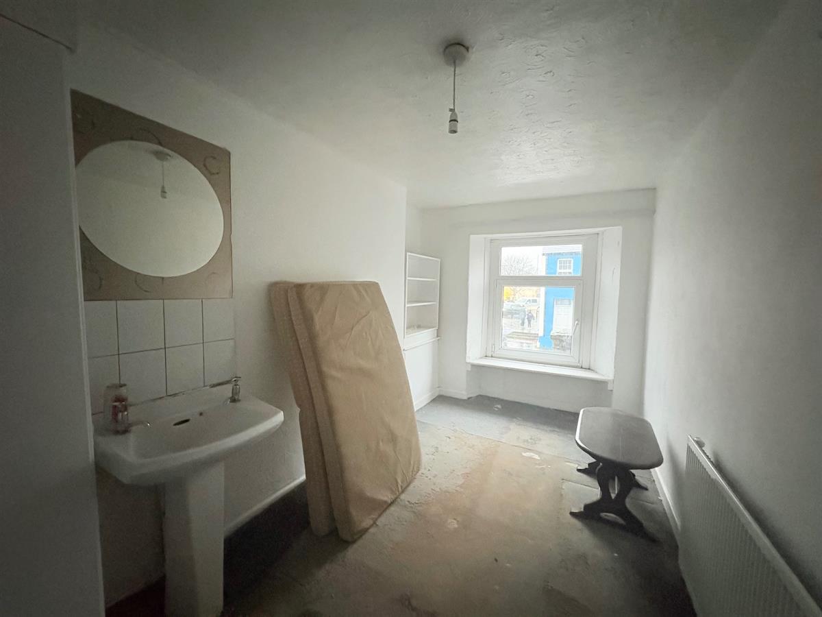 White door upon entry, fitted sink, grey carpets, white walls, white radiator, one window overlooking front of the property, various plug sockets.